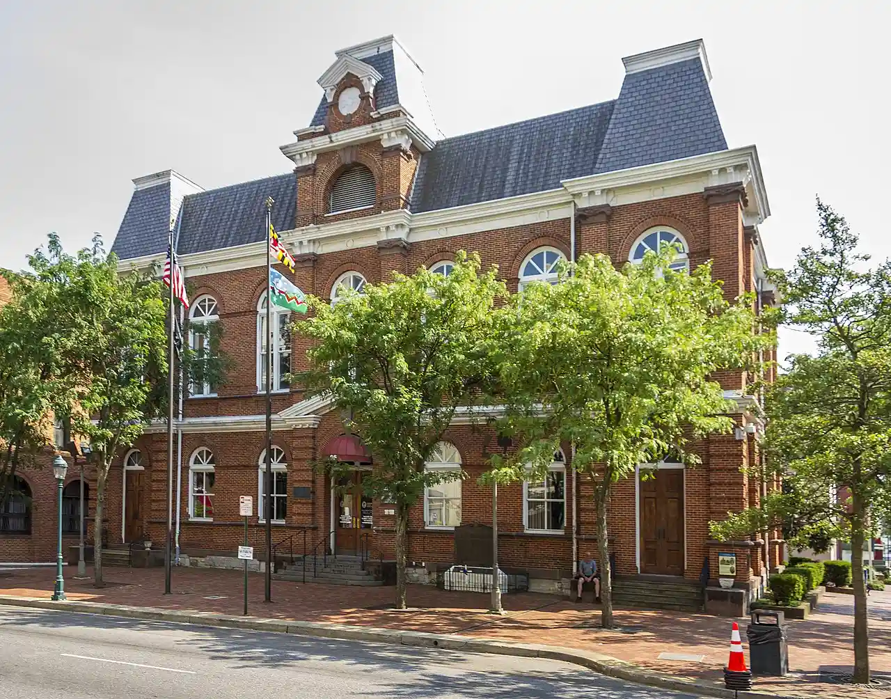Washington County Courthouse is a historic courthouse building located at 95 West Washington Street in Hagerstown, Washington County, Maryland, United States. It is a two-story red brick structure with white trim and decorative work in brownstone, constructed in 1872 in the Italianate style. The building features a central tower on the front façade above the main entrance and a coursed limestone foundation from an earlier courthouse which burned. It also has a mansard roof covered with shingles. The annex was built in 1963. Read more on Wikipedia