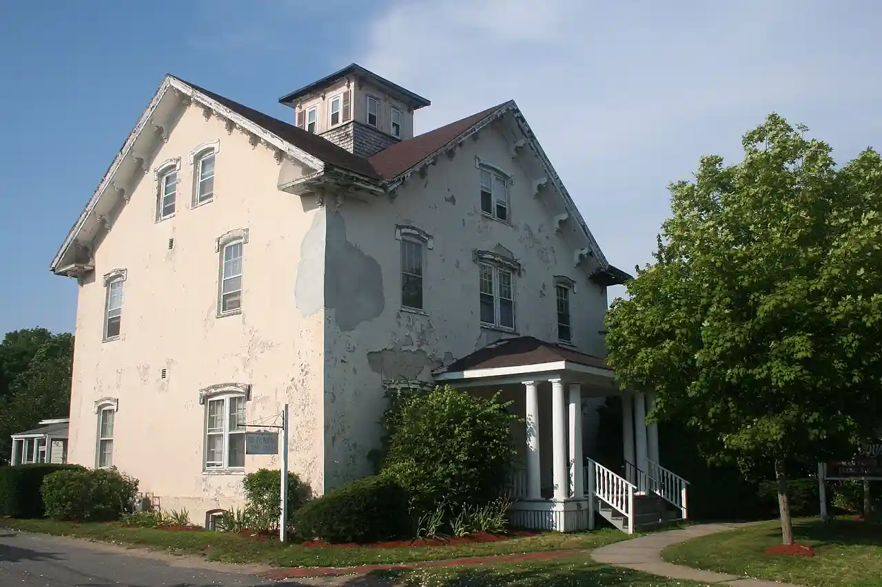 The Capt. Sylvester Baxter House is a historic house in Barnstable, Massachusetts. The -story wood frame Italianate house was built c. 1855 by Captain Sylvester Baxter, a politically prominent local ship's captain. The house exterior has been stuccoed, and the roof is a cross-gable style with a square cupola on top. The eaves of the roof and cupola are studded with decorative brackets. The windows are topped by stilted segmented arches. The front entrance is sheltered by a hip-roofed porch supported by clusters of round columns. Read more on Wikipedia