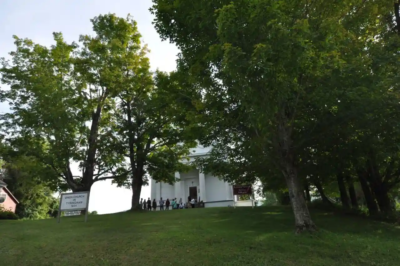 Methodist Episcopal Society of Tyringham (or the Union Church and Parsonage) is a historic church at 128-130 Main Road in Tyringham, Massachusetts, and is presently the only church standing in the community. The property includes a Greek Revival church building built in 1844, and a parsonage house next door. Between 1844 and 1907, the church was also used for town meetings. The property was listed on the National Register of Historic Places in 2000. Read more on Wikipedia