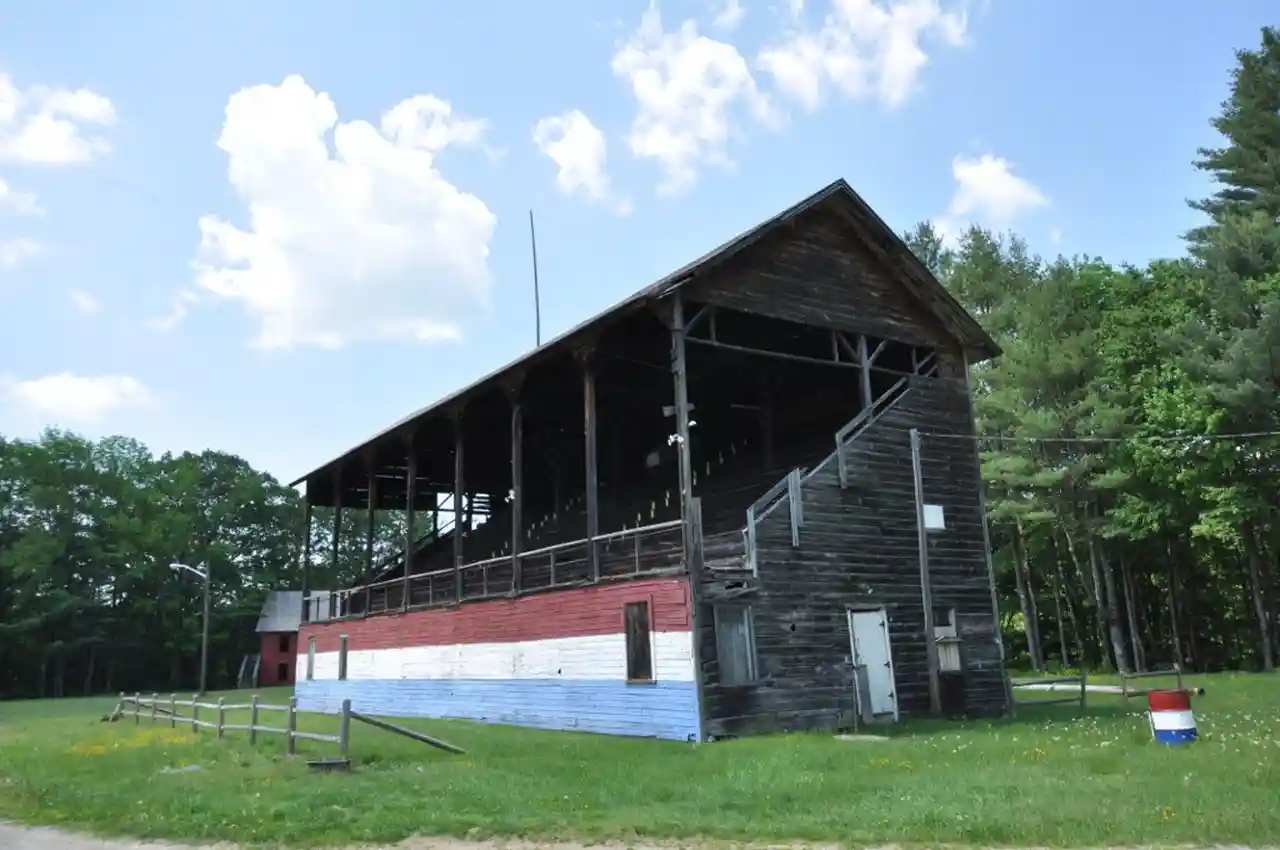 The former Deerfield Valley Agricultural Society Fairgrounds or Charlemont Fairgrounds, now known as Memorial Park, is a public park in Charlemont, Massachusetts, United States. The property occupies a plateau above the town, and is reached via an access road (Park Road) from Massachusetts Route 8A near the Bissell Bridge. Now a passive recreation facility managed by the town, it is one of the least-altered 19th-century fairgrounds in the state, with a grandstand, exhibition building, and racetrack built in the late 19th century. The property was listed on the National Register of Historic Places in 2011. Read more on Wikipedia