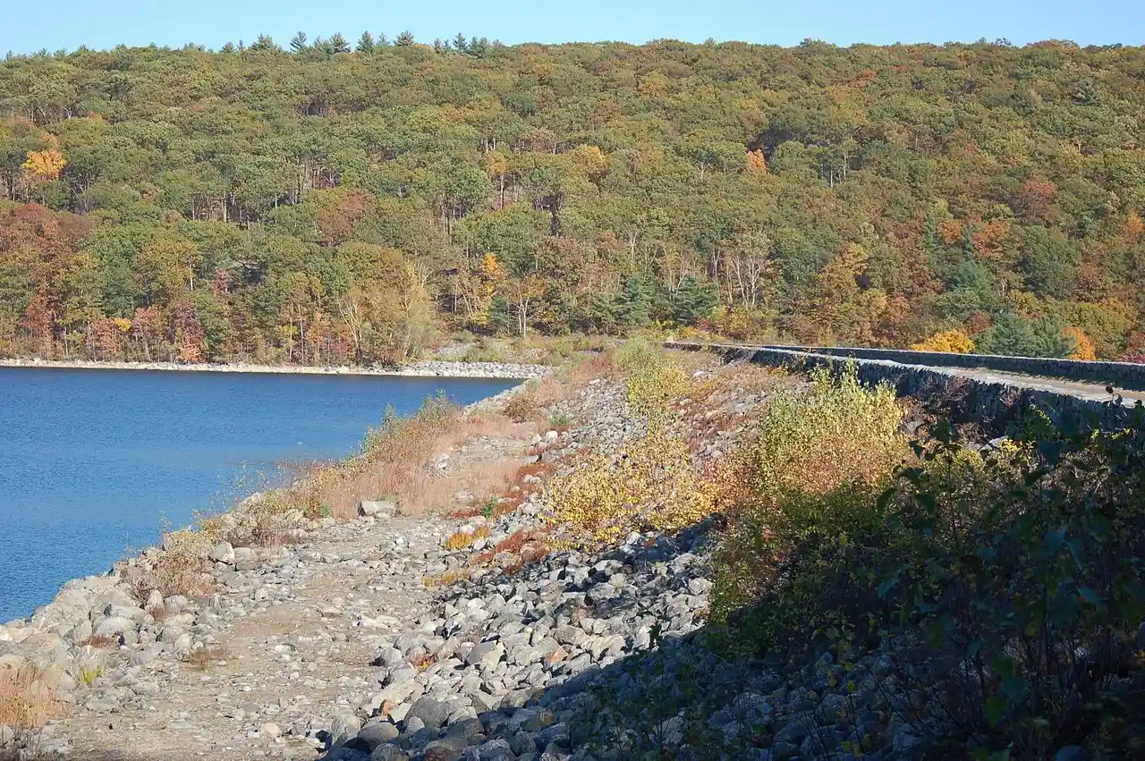 The Goodnough Dike (actually a dam) is on the southeastern end of the Quabbin Reservoir, the largest water body in Massachusetts. It impounds the waters of Beaver Brook and therefore closes that exit to the Chicopee River Watershed. The Goodnough Dike is not as large as the Winsor Dam, but it is equally important as they both trap the waters of the Quabbin Reservoir. This dam is part of the metropolitan Boston's water supply, maintained by the Massachusetts Water Resources Authority. Read more on Wikipedia