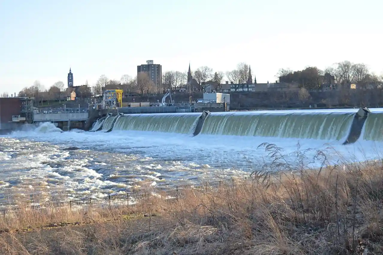 The Holyoke Dam, also referred to as the Hadley Falls Dam, or Hadley Falls Station is a granite dam built in tandem with the Holyoke Canal System at Hadley Falls on the Connecticut River, between Holyoke and South Hadley, Massachusetts. The water differential created by the dam produced mechanical hydropower for industrial uses in Holyoke, and later hydroelectric power. Read more on Wikipedia