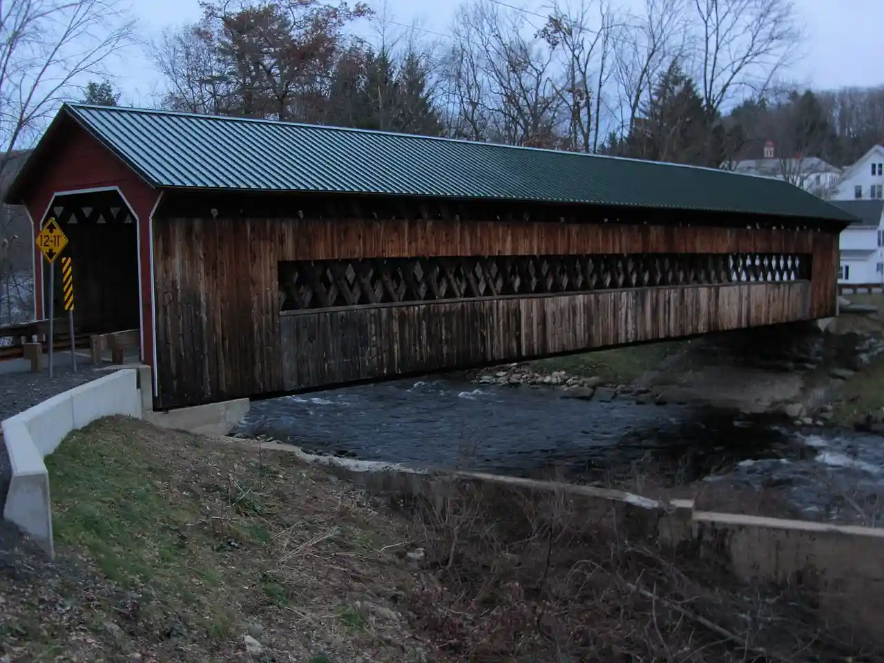Ware–Hardwick Covered Bridge is a historic covered bridge spanning the Ware River on Old Gilbertville Road and Bridge Street in Ware and Hardwick, Massachusetts. It is one of a small number of surviving 19th-century covered bridges in the state. The bridge was built in 1886, extensively rebuilt in 1986–1987, and was closed in 2002 due to structural issues and a limited carrying capacity. The bridge reopened in October 2010 and no longer has a weight limit according to MassDOT. It was listed on the National Register of Historic Places in 1986. Read more on Wikipedia