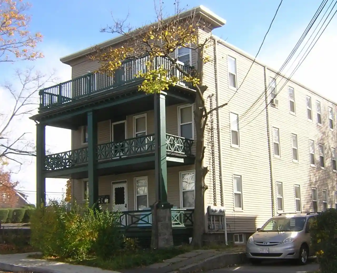 The Building at 51 Hunt Street in Quincy, Massachusetts, is one of a relatively small number of triple decker apartment buildings in the city. Built in 1907 by Charles Stratton as part of his development of North Quincy as a rail-commuter suburb, it is a three-story wood-frame structure, with a flat roof and wooden clapboard siding. The building is notable for its high parapet and its unusual porch balustrades. The roof line has a cornice with dentil moulding and simple brackets. Read more on Wikipedia