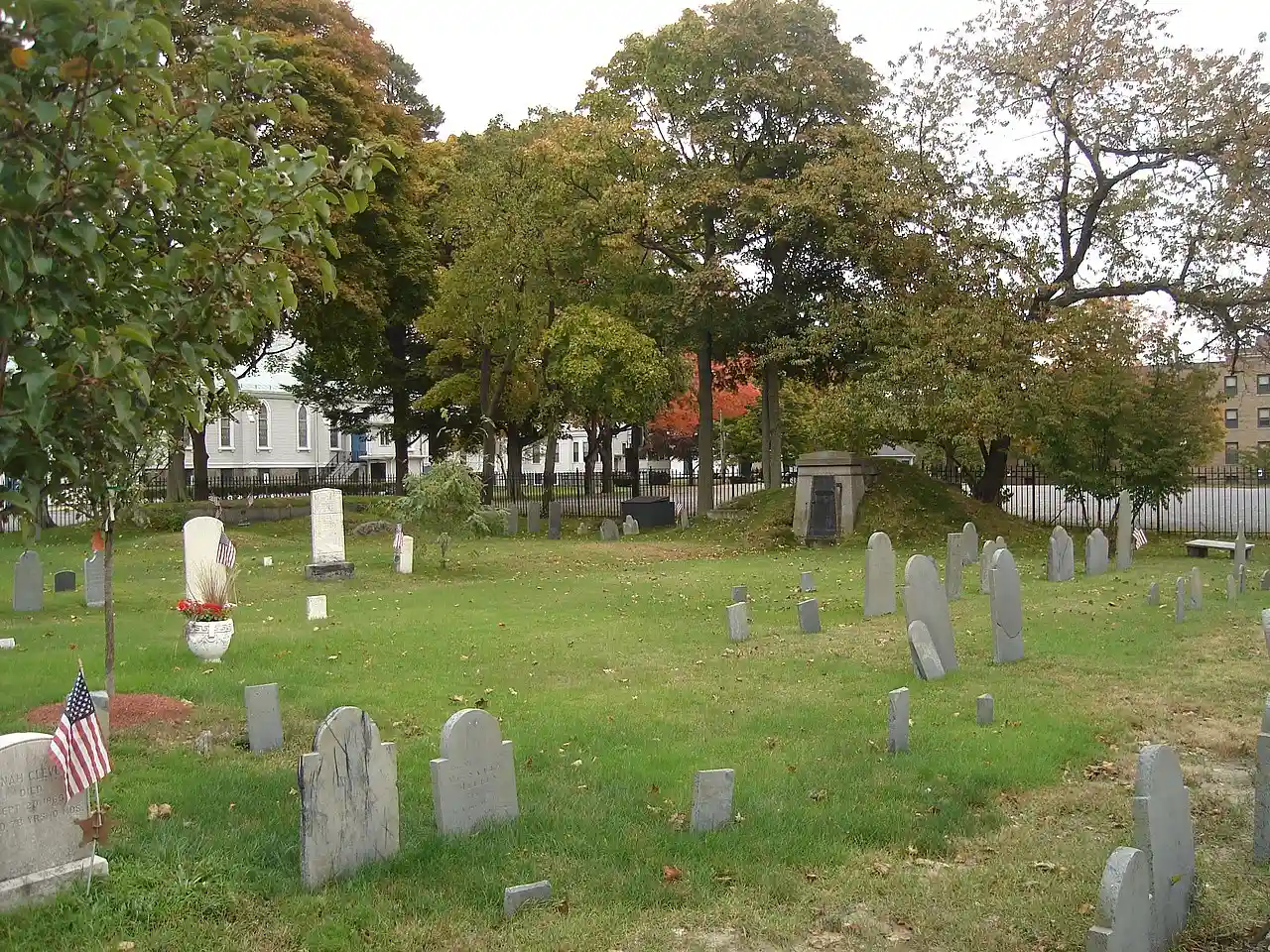 The Christ Church Burial Ground is a historic cemetery at 54–60 School Street in Quincy, Massachusetts. It is the cemetery of the Anglican Christ Church congregation, the second to be established in colonial Massachusetts. It is the site of the congregation's first church building, completed 1727, of which only a foundation element survives. The site's oldest grave marker is dated 1737; there may be older, unmarked graves. There are about 75 marked graves. Read more on Wikipedia