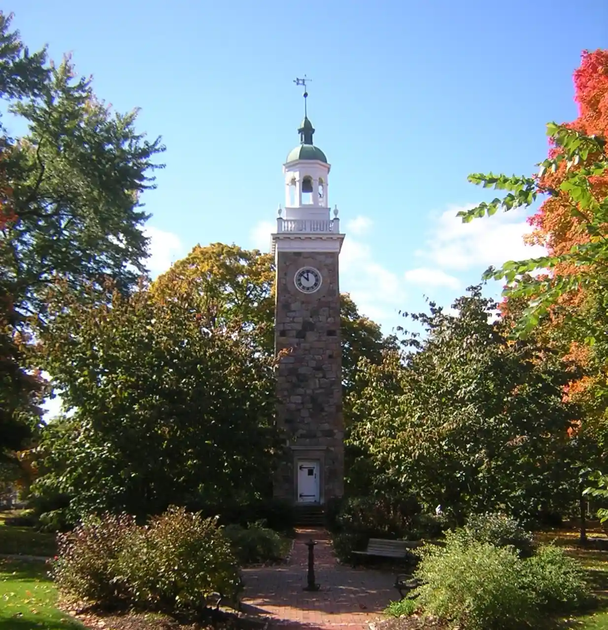 Elm Park, also known as Clocktower Park, is a historic park near the junction of Massachusetts Route 16 and Massachusetts Route 9 in the Wellesley Hills section of Wellesley, Massachusetts. It is a triangular parcel of , laid out for passive recreation. Its focal point is the brick and masonry Sprague Tower, designed by Benjamin Proctor, Jr., and built in 1928 to house a clock and bell given to the town in 1874. A portion of the now-defunct Cochituate Aqueduct passes through the park. Land for the park was acquired in 1908 by the town with funds raised by the community; the clock and bell were the gift of John Shaw. Isaac Sprague, for whom the tower is named, sat on the committee which oversaw its construction, and donated materials for that purpose. Read more on Wikipedia