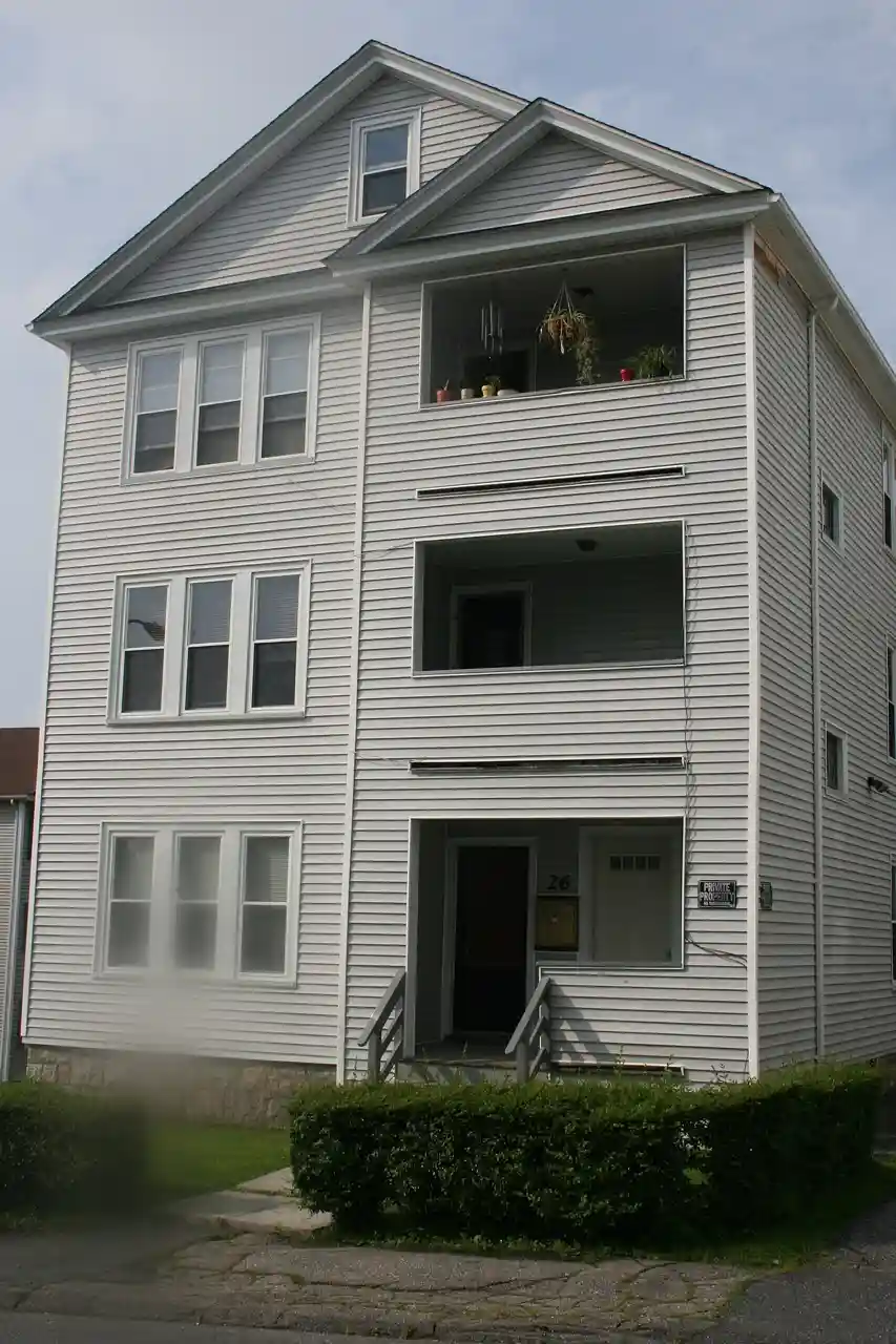 The Andrew Friberg Three-Decker is a historic triple decker in Worcester, Massachusetts, United States. Built about 1928, it was listed on the National Register of Historic Places in 1990, noted for its Colonial Revival styling. These details have been lost or obscured by later exterior siding installation (see photo). Read more on Wikipedia