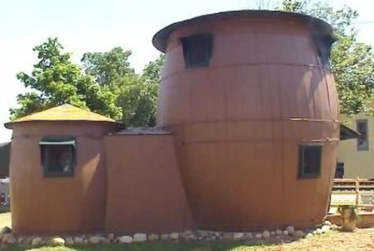 The Pickle Barrel House is a two-story cabin built to in the shape of two barrels. The house design is based on the artwork of William Donahey, an author-illustrator who created the Teenie Weenies cartoon characters that were tall and lived under a rose bush in a pickle barrel. The house was used as a summer home by Donahey and his wife for ten years. It is currently located in Grand Marais on Michigan's Upper Peninsula near the southern shore of Lake Superior. It is near the intersection of State Highway M-77 and County Highway H-58 in this gateway town to the Pictured Rocks National Lakeshore. The main part is a barrel and has two stories. The main floor is for the living area, and the upstairs is a bedroom. A smaller barrel serves as the kitchen, and the two barrels are connected by a pantry. There is an outdoor seating area with a large historical marker. Read more on Wikipedia