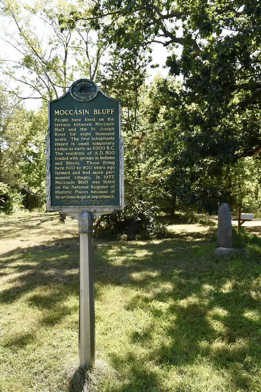 The Moccasin Bluff site (also designated 20BE8) is an archaeological site located along the Red Bud Trail and the St. Joseph River north of Buchanan, Michigan. It was listed on the National Register of Historic Places in 1977, and has been classified as a multi-component prehistoric site with the major component dating to the Late Woodland/Upper Mississippian period. Read more on Wikipedia