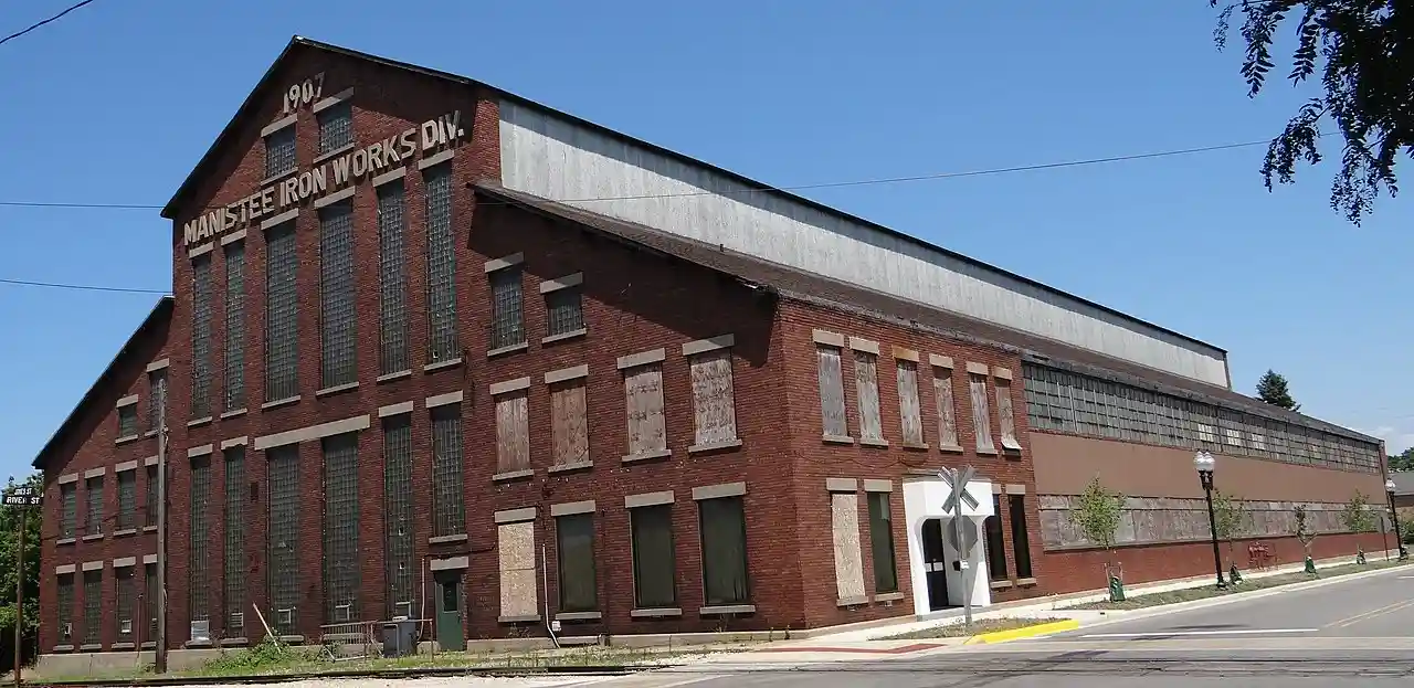 The Manistee Iron Works, also known as the Excello factory, was a manufacturing company based in Manistee, Michigan. While the company has since gone out of business, the factory built by the company in 1907 continues to bear the company's name and is a landmark in Manistee's historic downtown area. The building was listed on the National Register of Historic Places in 2010. Read more on Wikipedia