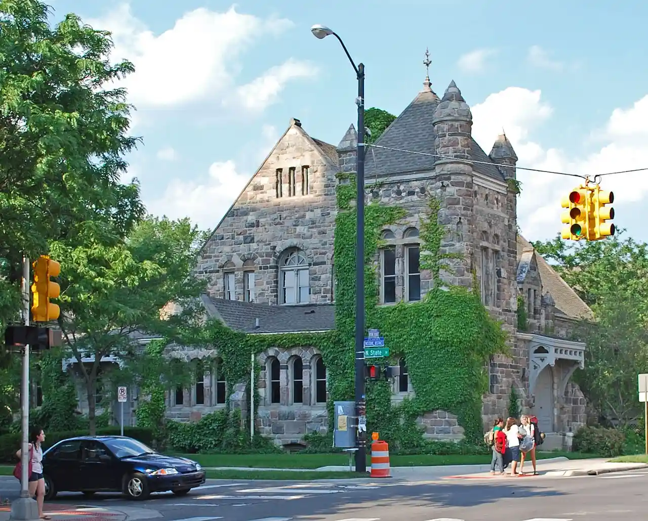 The Unitarian Universalist Church (also known as Grace Bible Church or First Unitarian Church) is a historic church building at 100 N. State Street in Ann Arbor, Michigan. It was listed on the National Register of Historic Places in 1978. Read more on Wikipedia