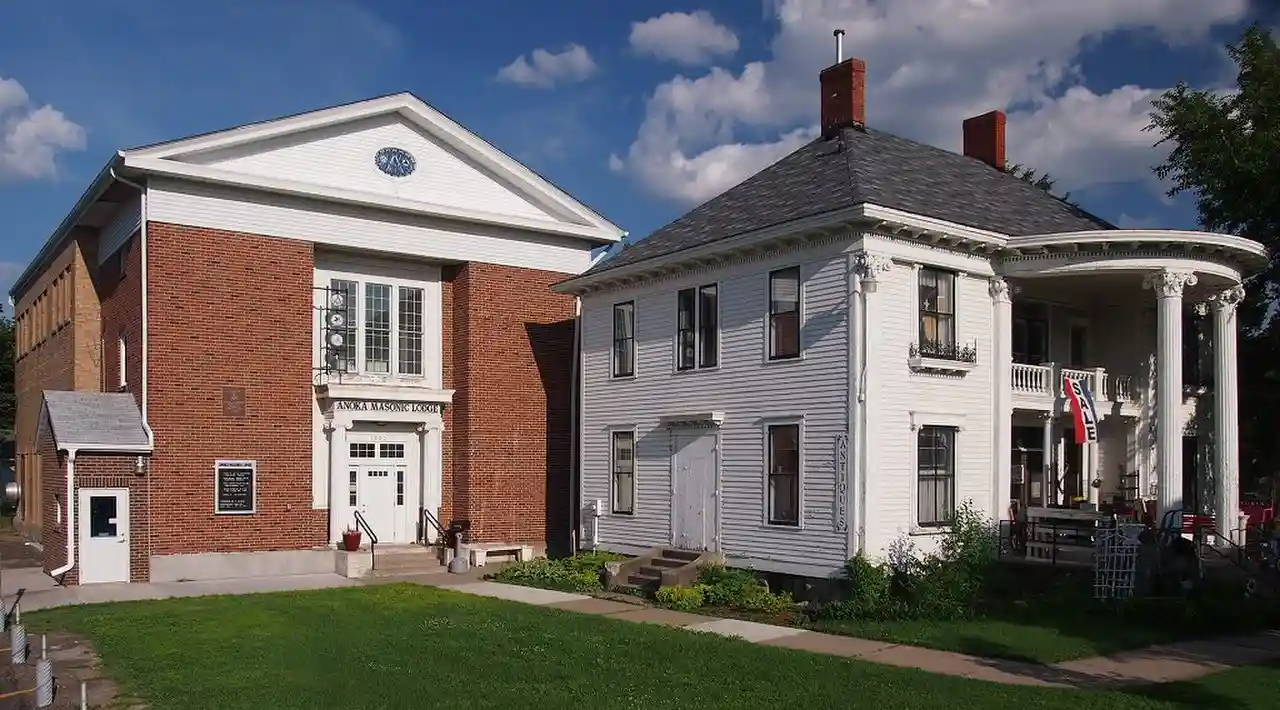 Colonial Hall and Masonic Lodge No. 30 consists of two historic buildings located at 1900 3rd Avenue, South in Anoka, Minnesota. Both were owned by Anoka Lodge No 30 AF & AM, which was chartered on October 25, 1859. Colonial Hall, also known as the Aldrich House for its association with the house's first owners and occupants, local medical and civil leaders Dr. Alanson and Dr. Flora Aldrich, is a two-story wooden building built in 1904 in a combination of Colonial Revival and Greek Revival styles by local renowned architect Fredrick Marsh. The Aldrich House was purchased by the Anoka Lodge in 1921, and in 1922, construction began on the present two-story redbrick Masonic temple, which is located behind but to the north of the Colonial Hall. Designed and built in the Georgian Revival style, it was completed and occupied in 1923. Read more on Wikipedia