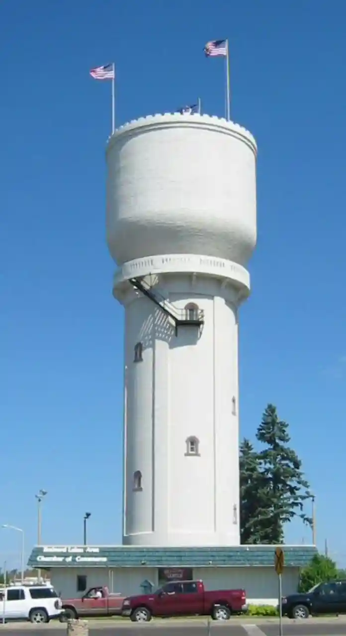 The Brainerd Water Tower is located at Sixth and Washington in Brainerd in the U.S. state of Minnesota. Built in 1918, it was the first all-concrete elevated tank used by a municipality in the United States; even though it was replaced in 1960, it remains standing as an icon of the town. It is referred to as "Paul Bunyan's Cup" or "Paul Bunyan's Flashlight" by local residents. The similar Pipestone Water Tower, also made of concrete, located in Pipestone, Minnesota, is the only other water tower in the United States known to have been designed by the architect L.P. Wolff. Read more on Wikipedia