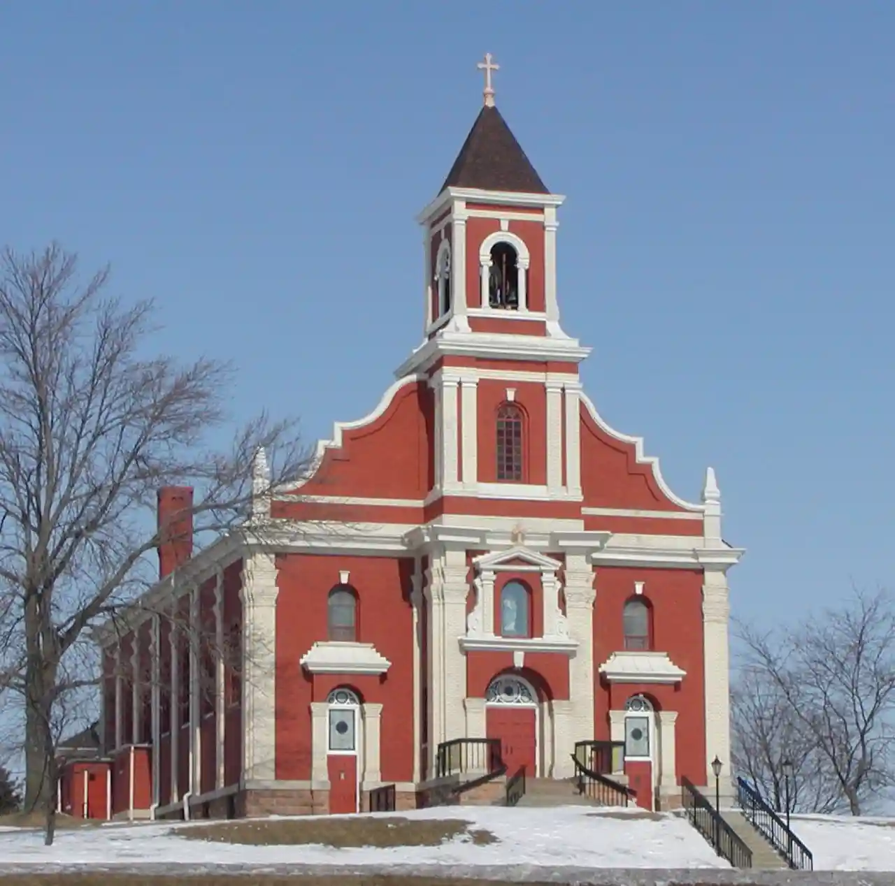 The Church of Saint Mary's is a 1909 Beaux-Arts Catholic church, located at 8433 239th Street East, New Trier in the U.S. state of Minnesota. The bright red building sits high on a hill overlooking the town, which was settled by German immigrants from Trier. The immigrants began arriving in 1854, and in 1857, they built a log church. In 1864, they built a larger stone church on a hill above the town. Read more on Wikipedia