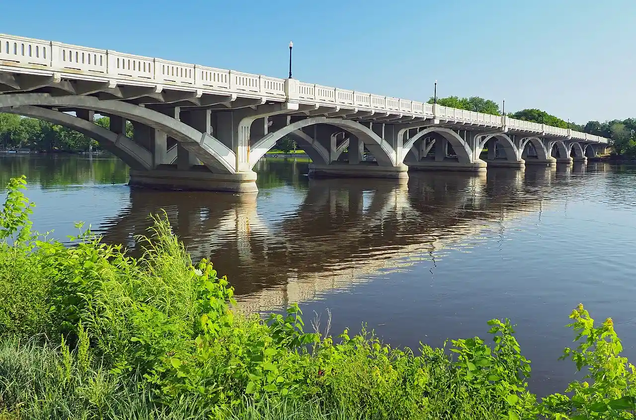 The Anoka–Champlin Mississippi River Bridge, also known as the Ferry Street Bridge, is a 10-span open spandrel concrete deck arch bridge that spans the Mississippi River between Anoka and Champlin, Minnesota, United States. It was built in 1929 by the Minneapolis Bridge Company, replacing an 1884 bridge at the same site. Read more on Wikipedia