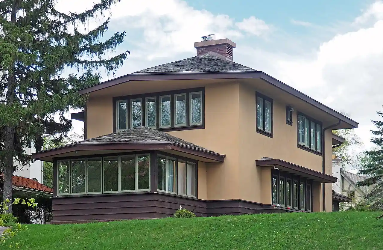 The Dr. Oscar Owre House is a historic house located at 2625 Newton Venue South just north of Lake of the Isles in Minneapolis, Minnesota. It was designed by notable local architects Purcell, Feick & Elmslie in the Prairie School style. Read more on Wikipedia