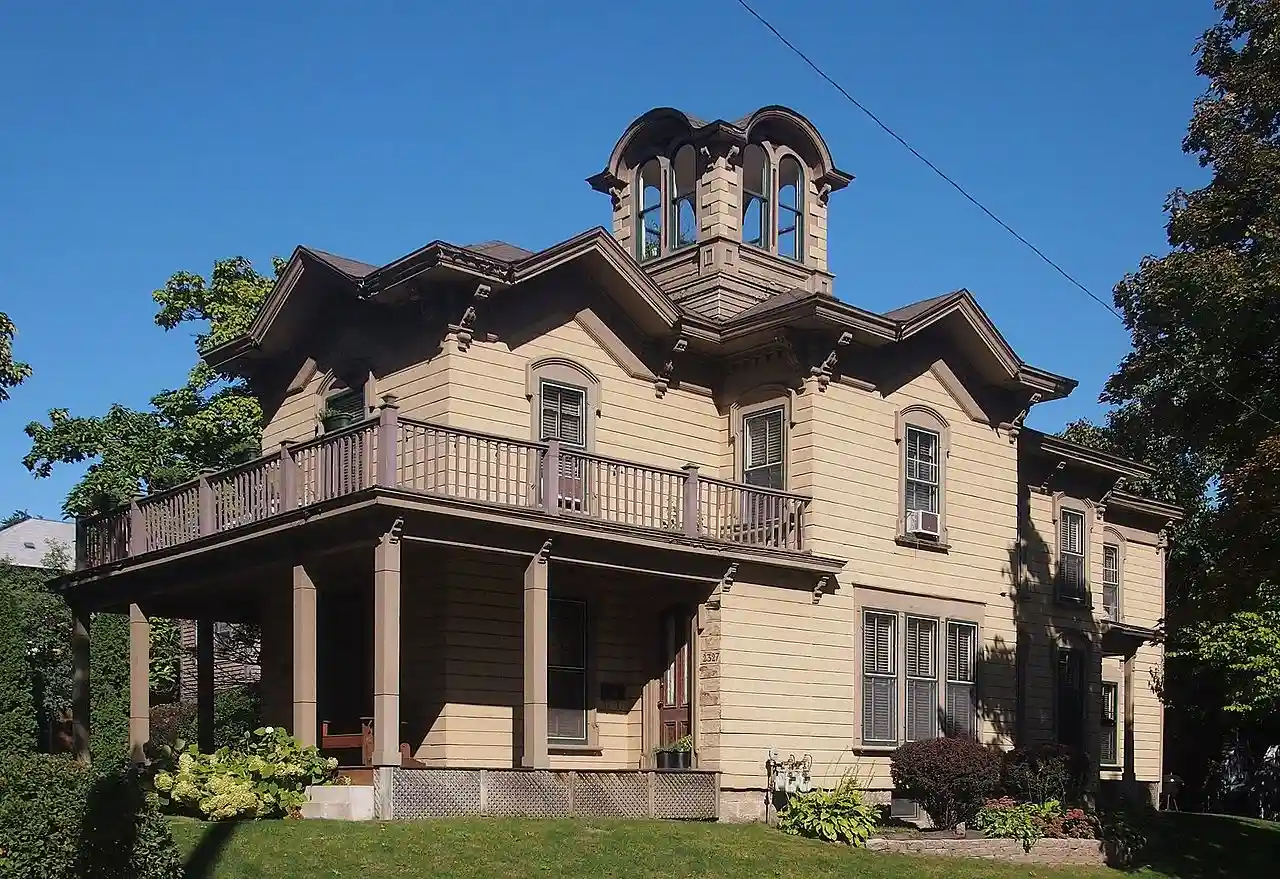 The Elisha and Lizzie Morse Jr. House is a house in the Whittier neighborhood of Minneapolis, Minnesota, United States, listed on the National Register of Historic Places. The house was built in 1870 in the Italian Villa style. Its most distinctive feature is the cupola with shallow arches over paired windows. The siding is also a unique design. The planks were made to look like cut stone by cutting incisions at regular intervals, then painting the siding with a mixture of paint and sand. This technique was rarely practiced in Minnesota architecture, and there are few surviving buildings with this treatment. Read more on Wikipedia