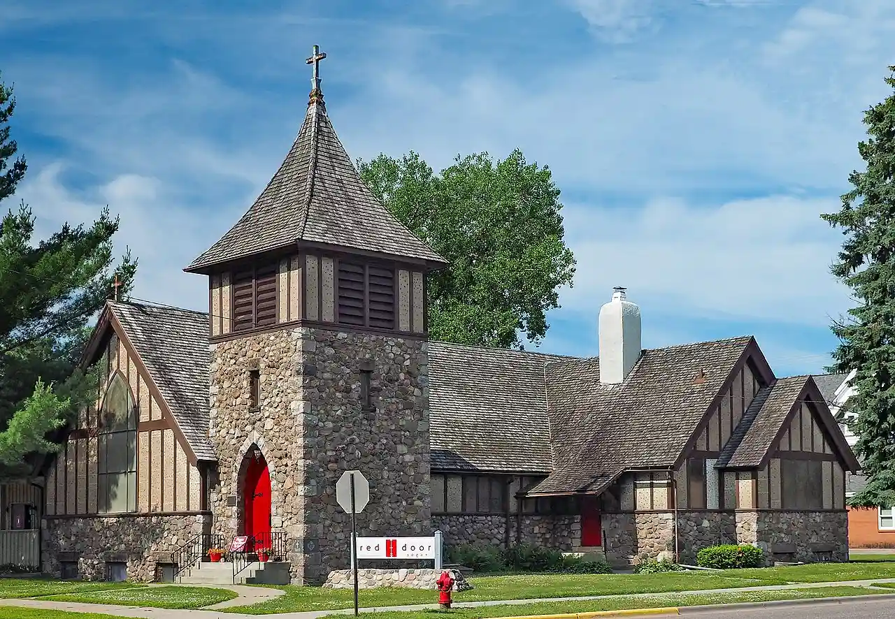 Episcopal Church of Our Savior is a historic church at 113 4th Street NE in Little Falls, Minnesota, United States. The congregation was established around 1858, as a missionary effort by Bishop Henry Whipple, and they built their first building around that time. The second church was built in 1869. The current building, built in 1903, was designed by John B. Sutcliffe from Chicago and built by Louis Triplett, a local builder. Its design blends Gothic and Tudor styles. The lower walls and foundation are built of fieldstone, while the upper sections of the walls are half-timbered with stucco. The corner tower is also made of fieldstone, topped by a bell tower with a flared shingled roof. Read more on Wikipedia
