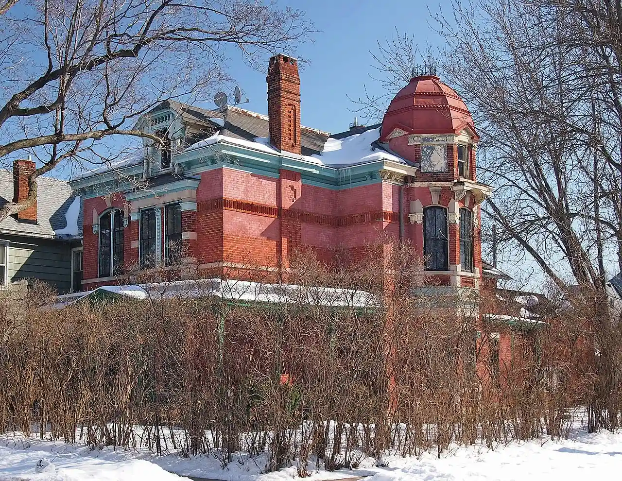 The Edward and Elizabeth Heimbach House and Carriage House is an 1890, high Victorian style, two-story, brick house in Saint Paul, Minnesota, United States, in the West Side neighborhood. The house has an octagonal tower and dome and a detached carriage house. Read more on Wikipedia