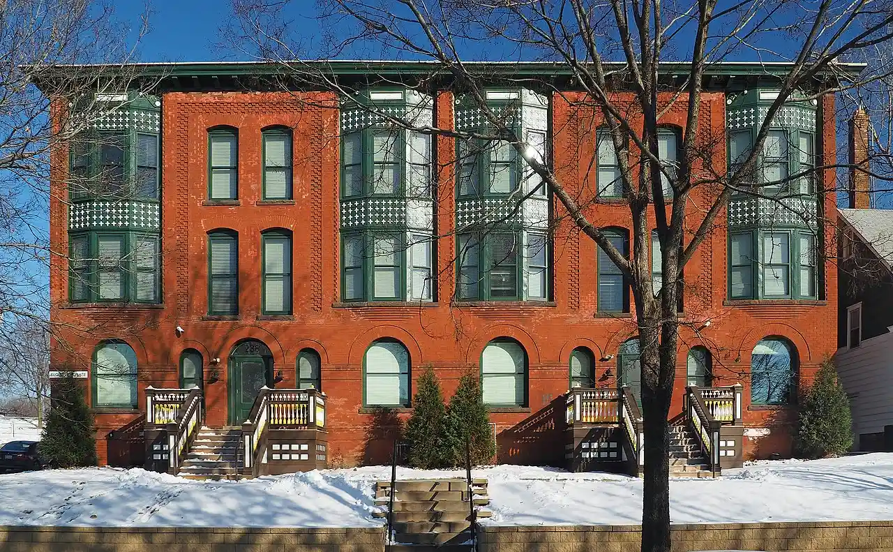 Euclid View Flats is a historic apartment building in Saint Paul, Minnesota, United States, constructed 1894–1895. It is listed on the National Register of Historic Places for its local significance in architecture. Euclid View Flats is a sophisticated early example of an apartment building designed to attract the middle class. Prior to the 1890s, multi-family housing in the United States was overwhelmingly in the form of tenements catering to the poor. Euclid View Flats provided an acceptable alternative to the single-family houses that dominated middle-class residential options in Saint Paul and the Dayton's Bluff neighborhood in particular. In addition to representing a change in housing preferences, the building reveals in its transitional architecture a shift from the highly ornamented Queen Anne style to the more restrained Romanesque Revival style during the same period. Read more on Wikipedia