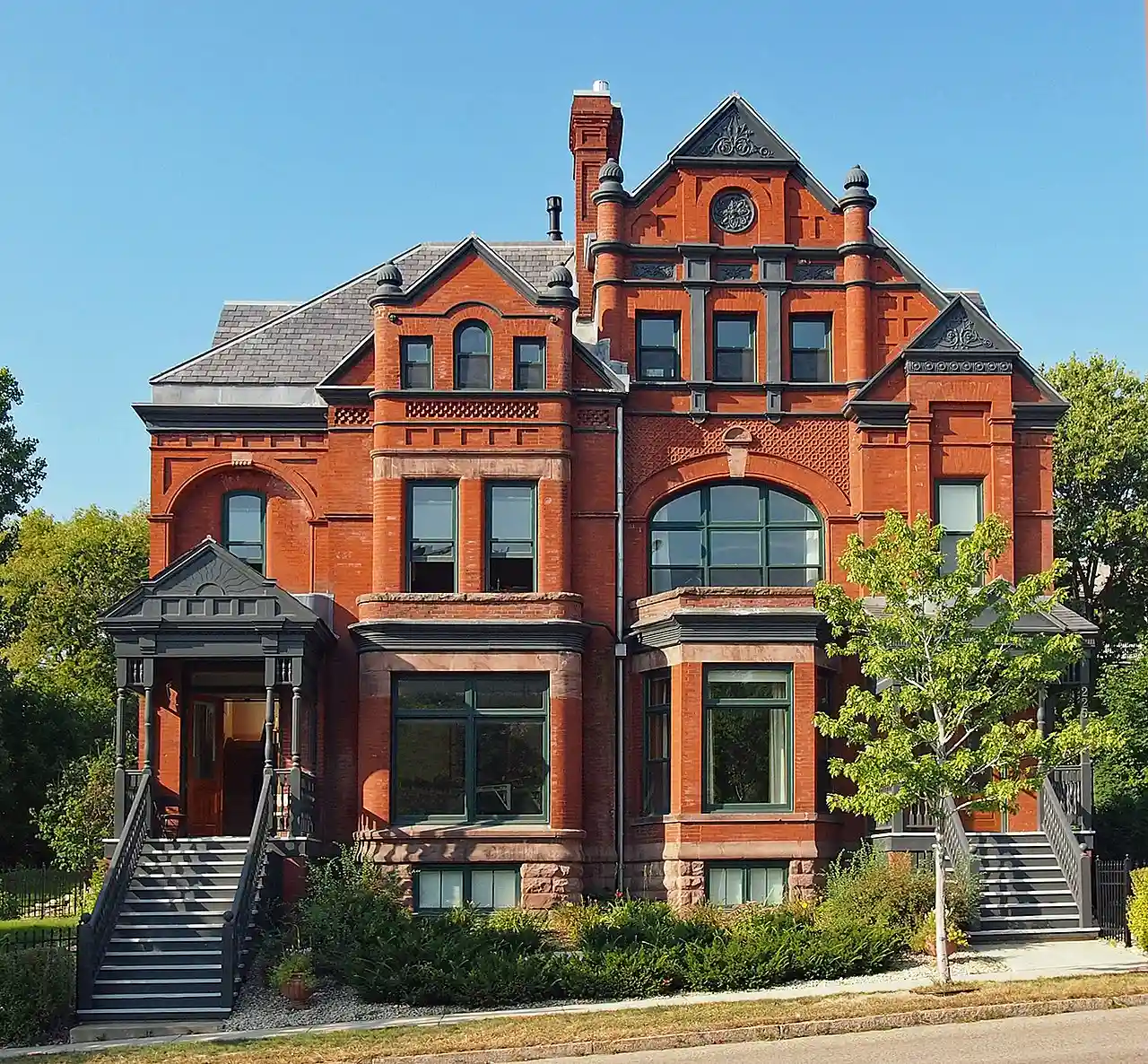 The John M. Armstrong House is in Saint Paul, Minnesota, United States. John Milton Armstrong, son of John Armstrong, Jr. (April 20, 1793 – December 22, 1865) hired architect Edward P. Bassford to design this side-by-side duplex in 1886 as income-producing residential housing. The red brick house was originally located at 233-235 West Fifth Street, but was moved to its present location on Eagle Parkway in November 2001. Read more on Wikipedia