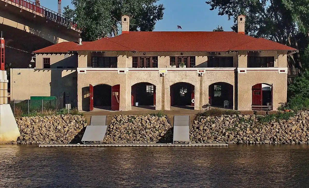 The Minnesota Boat Club Boathouse on Raspberry Island is a historic structure in Saint Paul, Minnesota, United States. It is the home of the Minnesota Boat Club, a rowing club founded in 1870, that is Minnesota's oldest athletic organization. In 1885, a wooden structure was built on Raspberry Island to house the Minnesota Boat Club. The club constructed a new boathouse in 1910, which was designed by George H. Carsley in the style of Mission Revival architecture. The boathouse building was listed on the National Register of Historic Places in 1982. Read more on Wikipedia