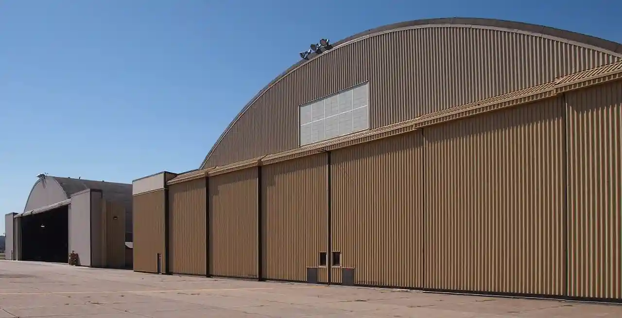 The Riverside Hangar is a historic hangar complex at the St. Paul Downtown Airport in Saint Paul, Minnesota, United States. It comprises two parallel hangars with a connecting structure and some additions. Built on the bank of the Mississippi River in 1942, it was part of a bomber modification center that operated at the airport during World War II. The two hangar buildings were constructed with glued laminated timber arches, an innovation born of wartime steel shortages. Their important design features were their low cost and that they were erectable quickly by unskilled workers. With Riverside Hangar was listed on the National Register of Historic Places for its state-level significance in the theme of engineering. It was nominated for being one of Minnesota's leading examples of glued laminated timber construction. Read more on Wikipedia