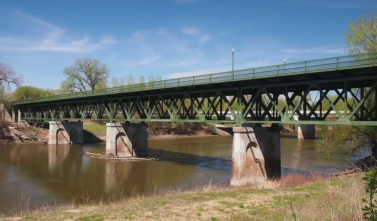 The Holmes Street Bridge, also known the Holmes Street Pedestrian Bridge, Old Shakopee Bridge, or Bridge 4175, is a historic truss bridge over the Minnesota River in Shakopee, Minnesota, United States. It is one of the state's only examples of a deck truss bridge. It was constructed in 1927 with parts manufactured by the Minneapolis Steel & Machinery Company. The bridge formerly carried US 169 and MN 101, and served as the principal river crossing for Shakopee. The Holmes Street Bridge was closed to vehicular traffic in 2005. It was rehabilitated in 2011 to carry a trail for pedestrians, cross-country skiers, and snowmobiles. Read more on Wikipedia