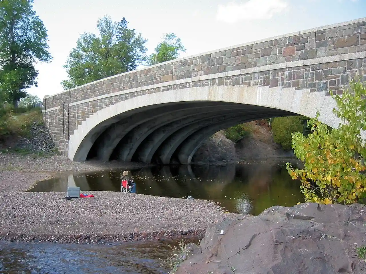 The Lester River Bridge (Bridge 5772) is a historic road bridge carrying Minnesota State Highway 61 (London Road) over the Lester River in Duluth, Minnesota, United States. Structurally it is a reinforced concrete arch bridge with decorative stone facing. It was built from 1924 to 1925. With In 2002 the bridge was listed as Lester River Bridge–Bridge No. 5772 on the National Register of Historic Places for its state-level significance in the themes of architecture, engineering, and transportation. It was nominated for its Neoclassical architecture, impressive span, and association with the opening of the highway along the scenic North Shore of Lake Superior. Read more on Wikipedia