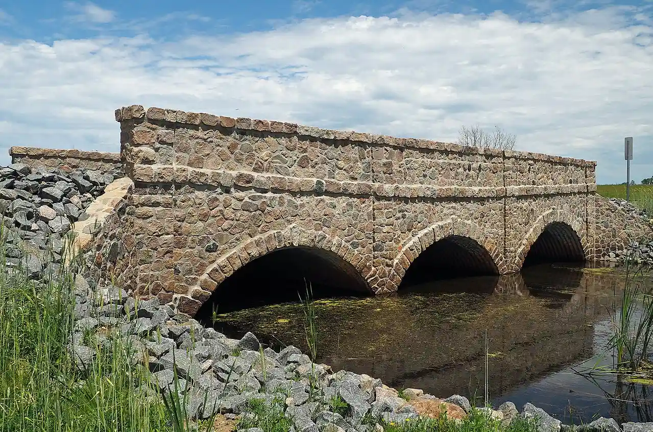 Bridge L7075 is a historic arch bridge in Hartford Township, Minnesota, United States. It was initially built around 1940 by the Works Progress Administration with a modular corrugated iron product called Multi Plate for the arches and a masonry façade. The bridge was expanded with a third arch around 1942. It was listed on the National Register of Historic Places as Bridge No. L7075 in 2016 for having local significance in the theme of engineering. It was nominated for being a distinctive example of the era's Multi Plate arch bridges and for the fine workmanship embodied in its WPA rustic architecture with Neoclassical detailing. Read more on Wikipedia