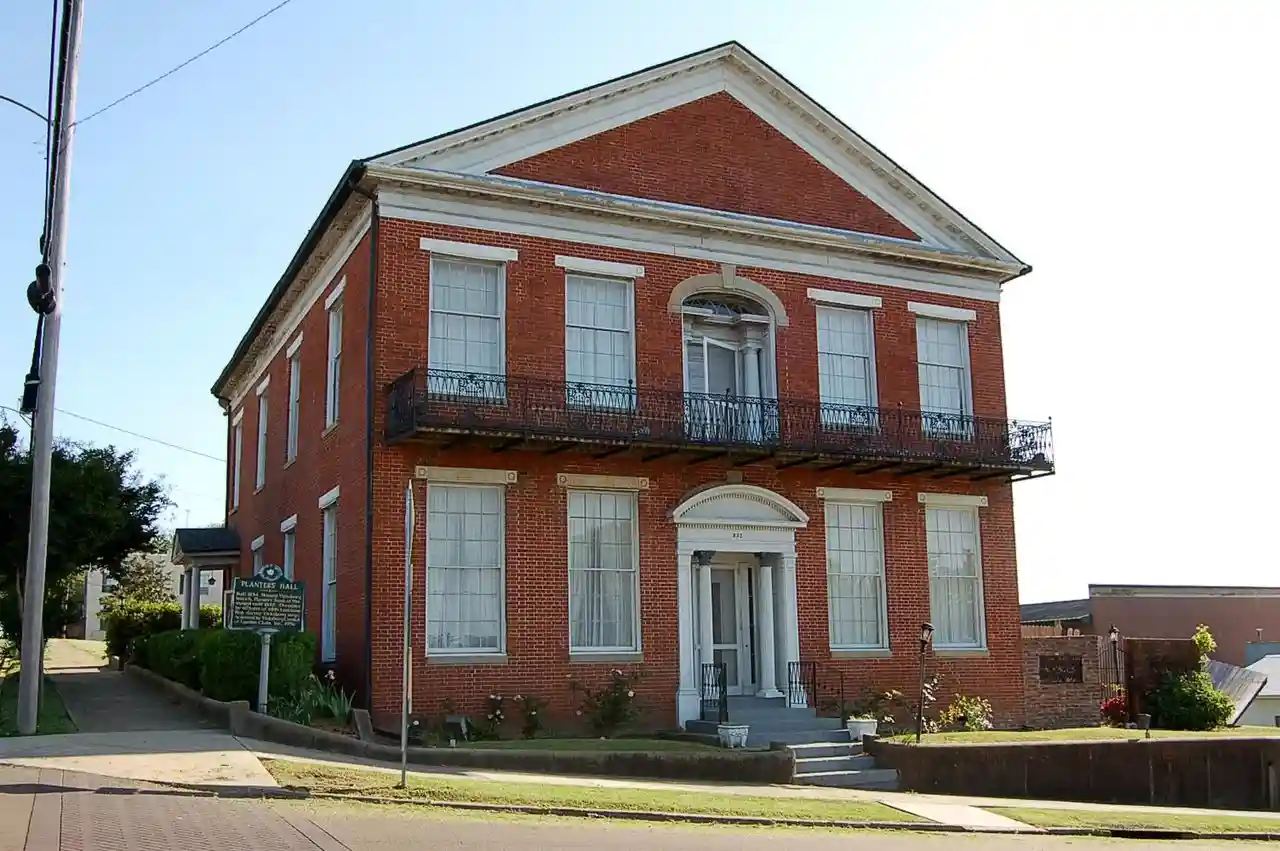 Planters Hall in Vicksburg, Mississippi was built in c.1834. It is a two-story brick Greek Revival building with brick laid in Flemish bond. Its first floor was a bank, and the second floor was a living quarters once occupied by the bank president. It was listed on the National Register of Historic Places in 1971. The boundaries of the listing were increased in 1988 to include two dependencies built before 1854: a kitchen and a carriage house/stable. Read more on Wikipedia