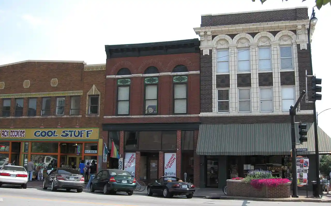 The Eighth and Broadway Historic District is one of the seven national historic districts located in Columbia, Missouri. The district is made up of three contributing properties and is located at the intersection of Eighth and Broadway Streets in Downtown Columbia. They consist of the Beaux-Arts style Miller Building (1910), the Italianate style Matthews Hardware (c. 1894), and the Art Deco style Metropolitan Building (c. 1930). Today, the area holds loft apartments and several local business including Rally House, Sycamore, Peace Nook, and Geisha. Read more on Wikipedia