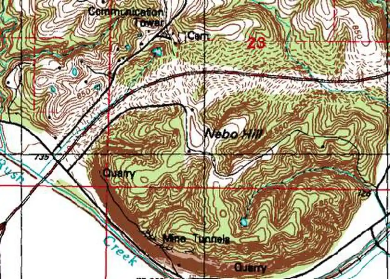 Nebo Hill Archeological Site is a prominent former river bluff located in Liberty, Missouri. It has one of the highest elevations in Clay County. One source states the hill is named after the family who owned the property in the 1900s, while according to another source the name is a transfer from Mount Nebo in Jordan. Read more on Wikipedia