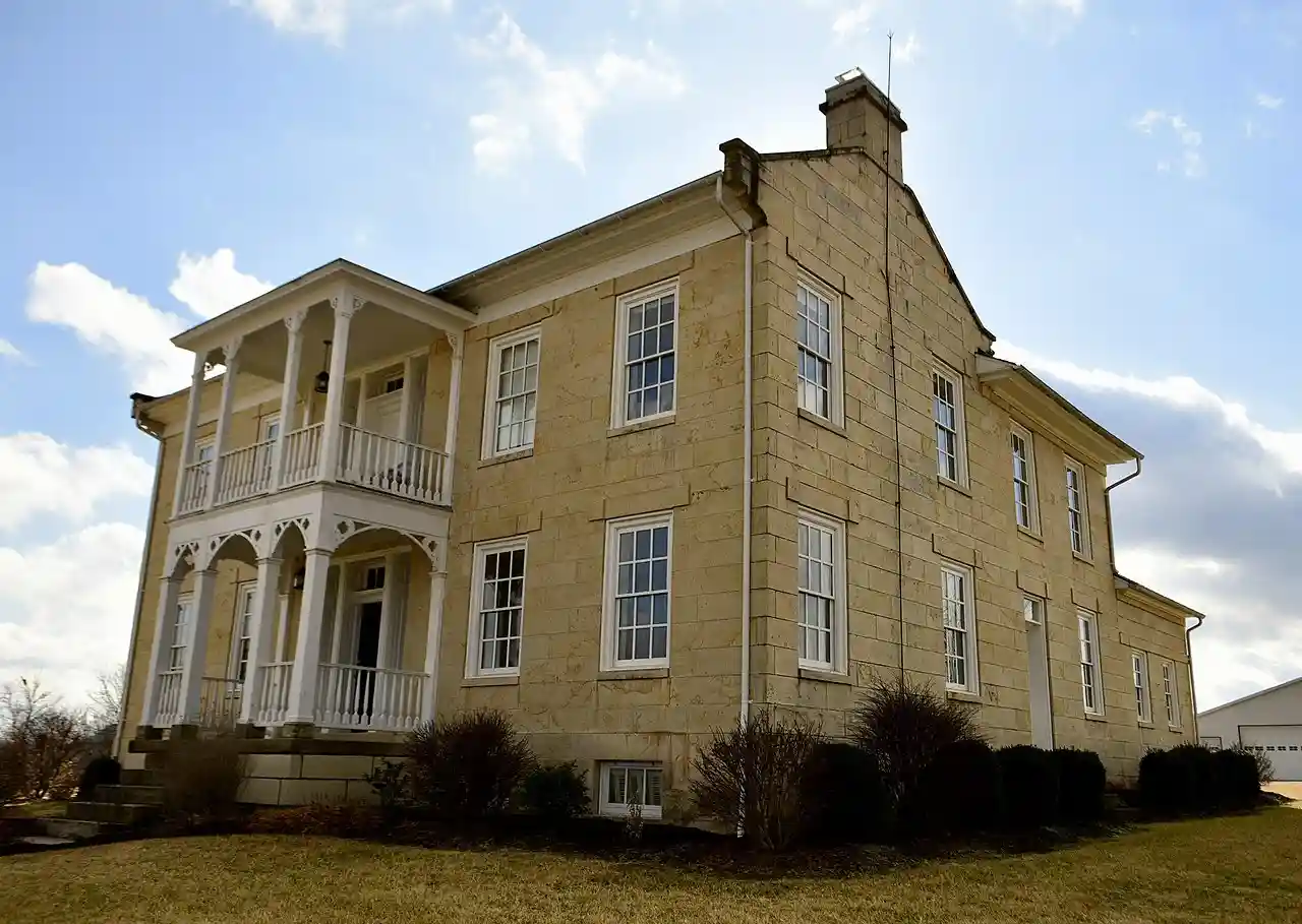 Lewis and Elizabeth Bolton House, also known as the Herman and Johanna Winkelmann House and Belleview Farm, is a historic home located south of Jefferson City, Cole County, Missouri. It was built about 1833, and is a two-story Greek Revival style stone I-house. It has a 1 1/2 to two-story rear ell. It is five bays wide, with a two-story central portico. (includes 15 photos from 1999 and a historic photo) Read more on Wikipedia