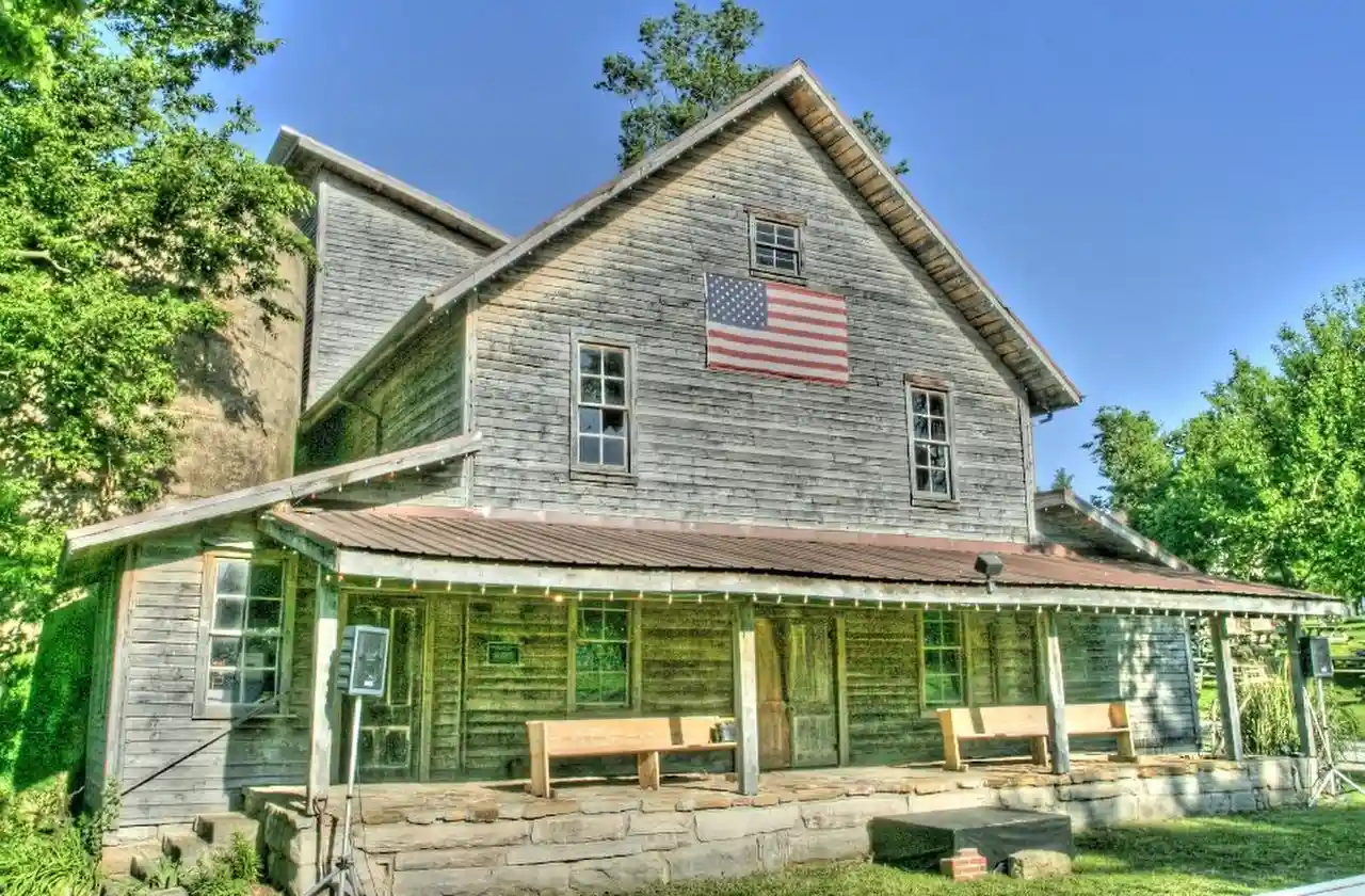 Boegel and Hine Flour Mill-Wommack Mill, also known as Grove Mill, is a historic grist mill complex located at Fair Grove, Greene County, Missouri. The mill was built in 1883, and is a 2 1/2-story, heavy timber frame building sided with vertical boards. Adjacent to the building are paired cylindrical grain storage silos of creek gravel concrete construction. The mill continued to operate until 1969. (includes 9 photographs from 1985) Read more on Wikipedia