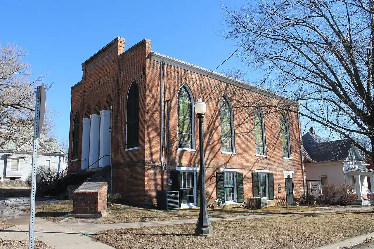 Glasgow Presbyterian Church, also known as Glasgow Community Museum, is a historic Presbyterian church located at Commerce and 4th Streets in Glasgow, Howard County, Missouri. It was built in 1860–1861, and is a one-story, brick building with simple Gothic Revival style design elements. The rectangular building measures 57 feet, 5 inches, by 37 feet, 3 inches, and features a board-and-batten vestibule and a Gothic arcade supported by brick pillars. It houses a local history museum. (includes 8 photographs from 1980) Read more on Wikipedia