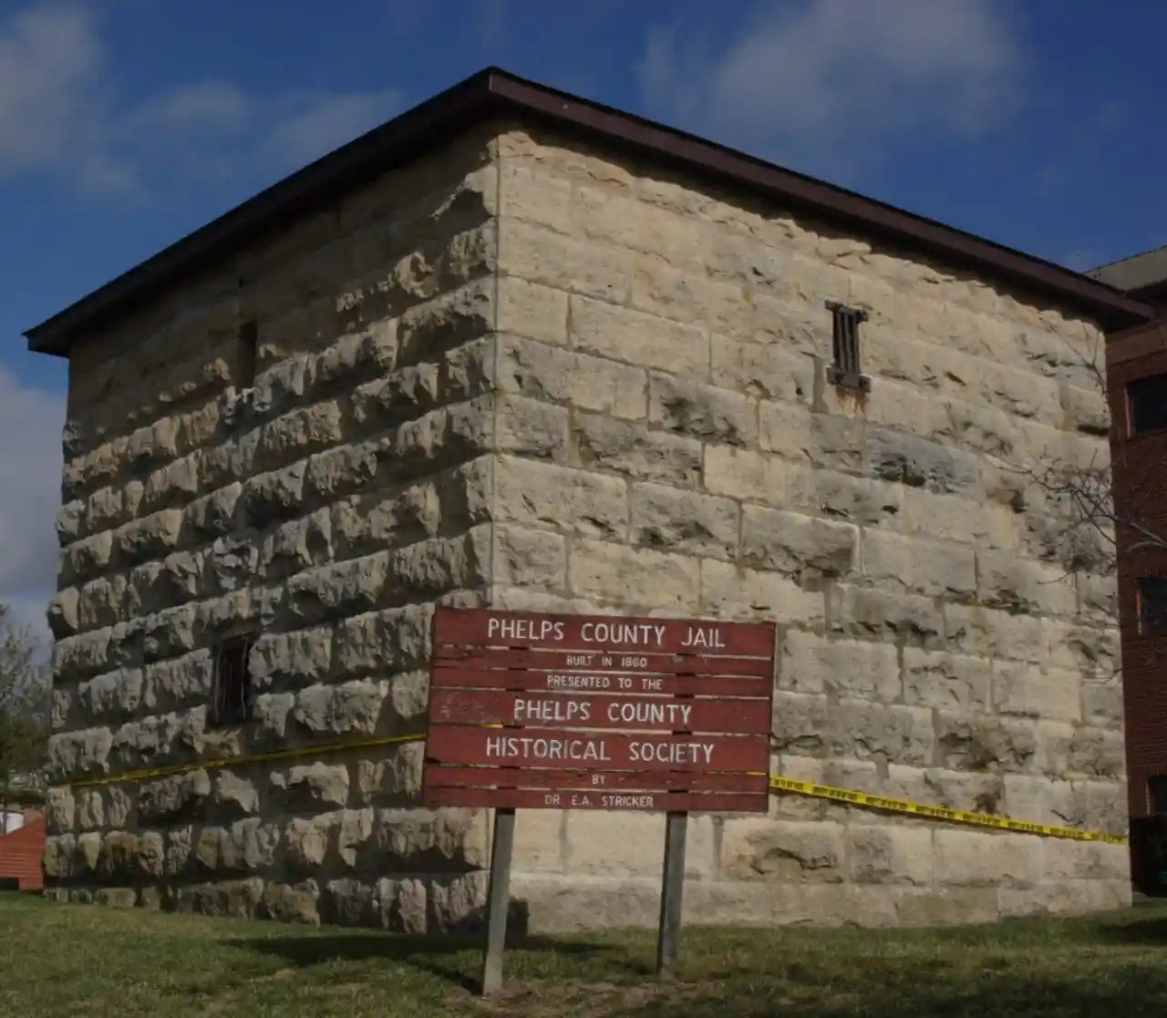 Phelps County Jail is a historic jail located on Park Street between Second and Third Streets, Rolla, Missouri, was built in 1860 for $3,000. The jail was operated by Phelps County from 1860 to 1912. Union forces, which took over the town in 1861, used the jail for both military and civilian prisoners during the American Civil War. The building's contractor, John A. Schnable, built the structure from solid dolomite blocks, measuring , which were quarried nearby. The lower floor contains two windowless stone cells for solitary confinement. The upper floor contains a single room with cages made from iron bars to hold multiple prisoners. The upper floor also includes a wood-burning stove used for heating. Dr. E.A. Stricker presented the jail to the Phelps County Historical Society in 1943. (includes 9 photographs from 1989) Read more on Wikipedia