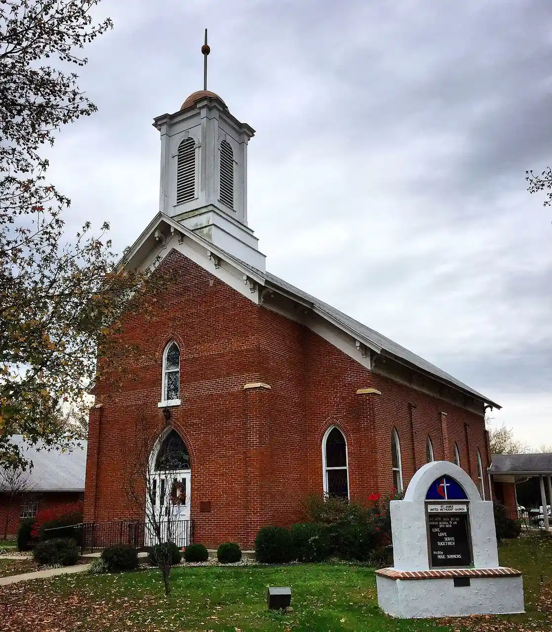 St. James Chapel, also known as the St. James United Methodist Church, is a historic Methodist chapel located at St. James, Phelps County, Missouri. It was built in 1868, and is a one-story red brick building with Gothic Revival and Romanesque Revival style design elements. It measures 40 feet by 60 feet, and has a gable roof. It features a bell tower topped by a dome. (includes 6 photographs from 1980) Read more on Wikipedia