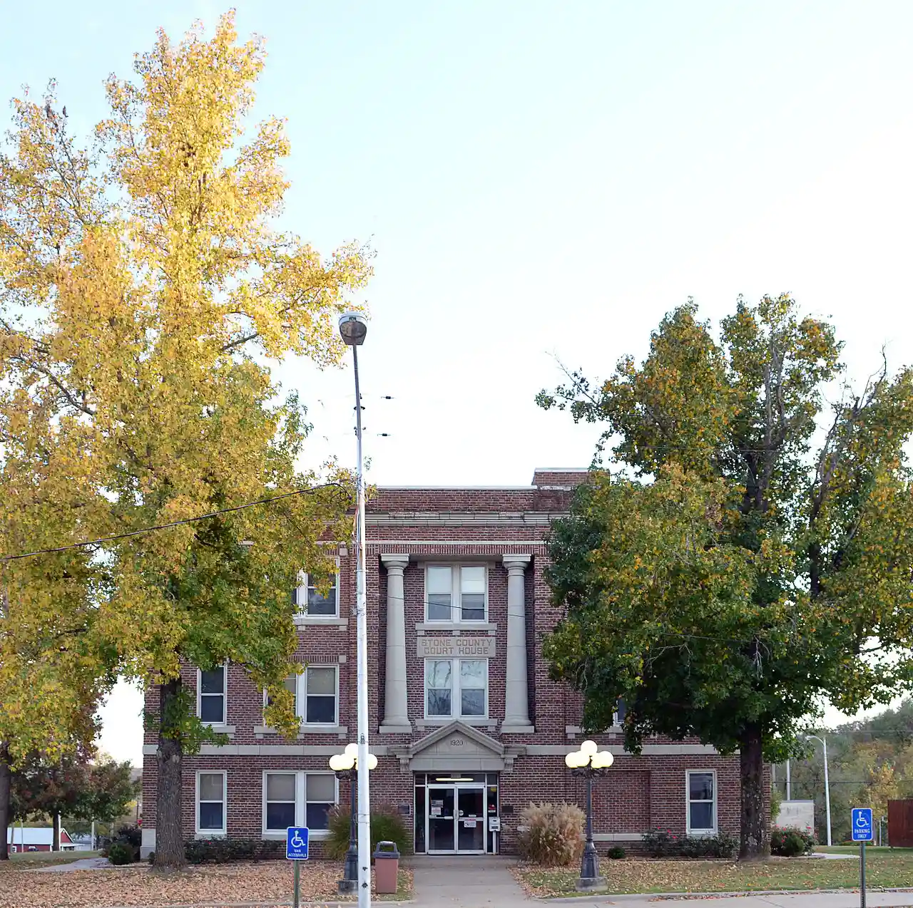 Stone County Courthouse is a historic courthouse located at Galena, Stone County, Missouri. It was built in 1920, and is a three-story, Classical Revival style brick building on a concrete foundation. It features two colossal, modified Doric order columns on a recessed wall plane at the second and third stories. (includes 7 photographs from 1979) It cost $47,600 to complete. Read more on Wikipedia