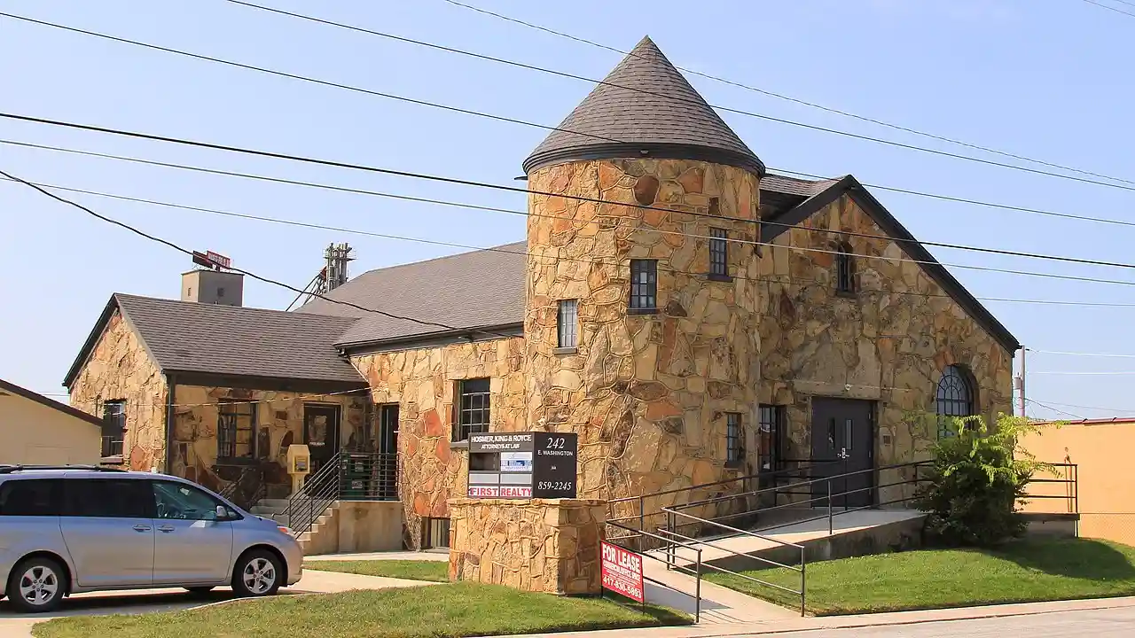 Rainey Funeral Home Building, also known as Roller-Brllce Funeral Home, Barber-Barto Funeral Home, Barber-Edwards Funeral Home, Barber-Edwards-Arthur Funeral Home, Arthur Funeral Home, and Arthur's Colonial Chapel, is a historic funeral home located at Marshfield, Webster County, Missouri. It was built about 1938, and consists of a -story rectangular main building, two-story tower, and a one-story wing. It is in the Tudor Revival style. It is of wood frame and steel construction with a facade of native Webster County fieldstone with raised mortar joints. The building features a round tower with a conical roof and glass block windows. (includes 20 photographs from 2013) Read more on Wikipedia