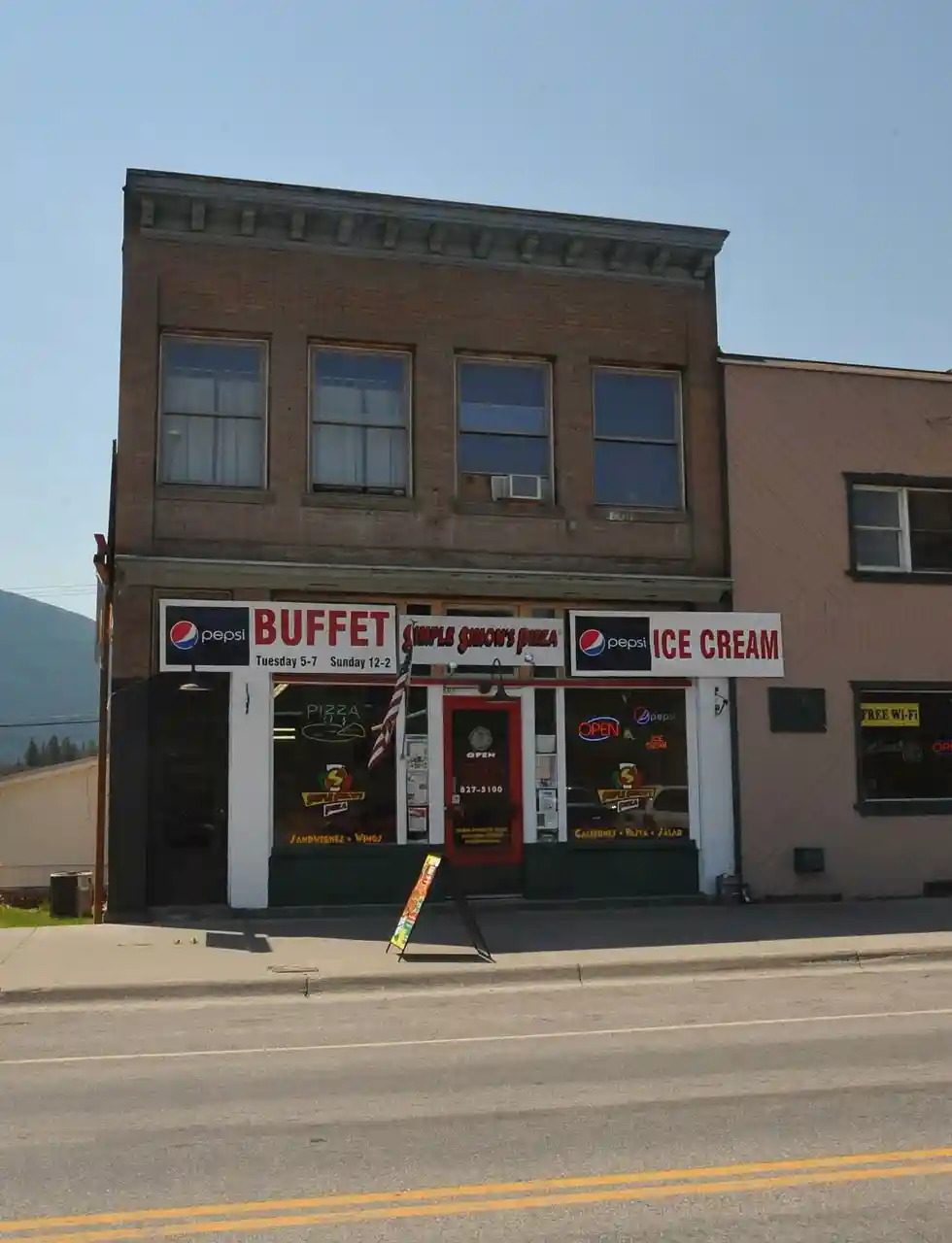 The Gem Saloon, at 808 Main St. in Thompson Falls, Montana, USA, was built in 1914. It is a historic building listed on the U.S. National Register of Historic Places. It has also been used by, and was known as, Napa Auto Parts, and has been a restaurant, too. When photographed in 2013 it held a pizza shop. Read more on Wikipedia