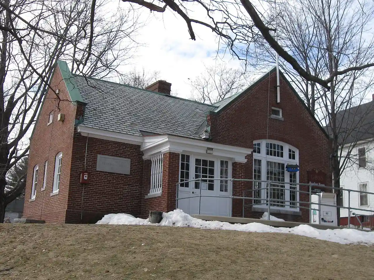 The Ossian Wilbur Goss Reading Room is a historic library building at 188 Elm Street in the Lakeport section of Laconia, New Hampshire. The architecturally eclectic single-story brick building was designed by Boston architect Willard P. Adden and built in 1905-06 after the collection of the former Lakeport library was moved to the recently built Gale Memorial Library in the center of Laconia. Its construction was funded by a bequest from Ossian Wilbur Goss, a local doctor who had died without natural heirs. The building officially became a branch of the Laconia library system in 1909, and continues to be administered in part by trustees of Goss's legacy. The building was listed on the National Register of Historic Places in 1986. Read more on Wikipedia