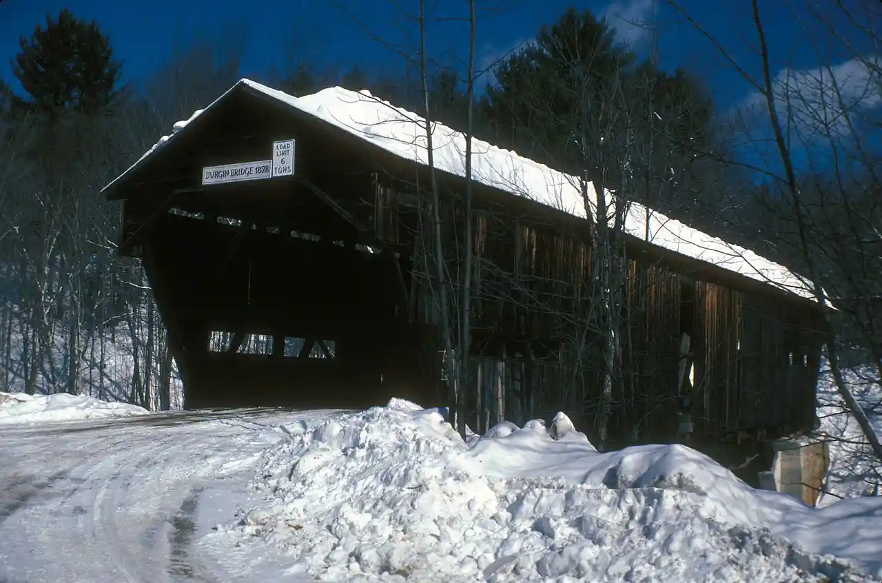The Durgin Bridge is a covered bridge carrying Durgin Bridge Road over the Cold River in eastern Sandwich, New Hampshire. Built in 1869, it is a rare surviving example of a Paddleford truss bridge, and one of the few surviving 19th-century covered bridges in New Hampshire. It was listed on the National Register of Historic Places in 1983. Read more on Wikipedia