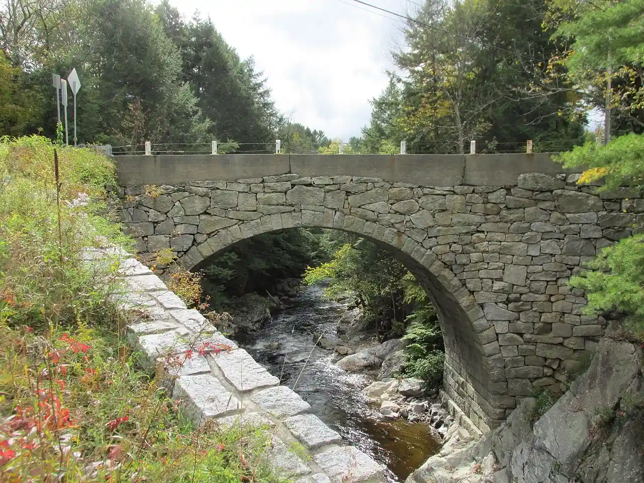 The Gilsum Stone Arch Bridge carries Surry Road over the Ashuelot River in Gilsum, New Hampshire. Built in 1862–63, it is one of the highest stone arch bridges in the state. It has a span of , and an average height over the river of . The roadway is above the riverbed. It stands on the site of four previous bridges, where the river passes through a deep gorge. The previous bridge was also a stone arch bridge, which was built in 1860 and collapsed (due to inferior construction) a few months later. It was designed by William Leonard Kingsbury, a local official; its builders are not known because the town's records were destroyed in a fire. The present bridge's vault is carefully constructed from dry-laid granite voussoirs that were shaped for a very precise fit, with larger stones at the lower ends of the arch, and a smaller ones at the crown. Some of the stones were left with rough surfaces, while others were hammered smooth. Read more on Wikipedia