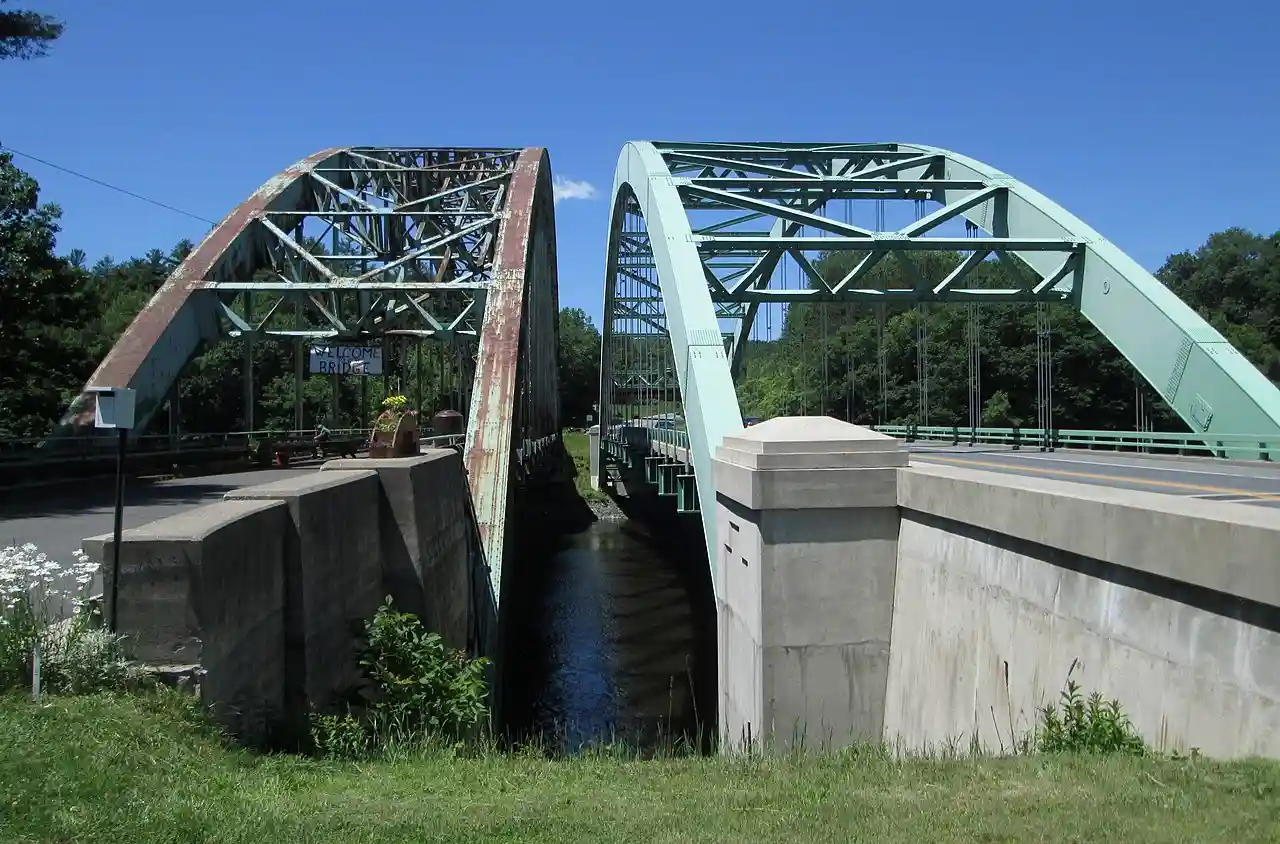 The United States Navy Seabees Bridge is a through-steel two-hinged arch bridge over the Connecticut River located between Brattleboro, Vermont, and Chesterfield, New Hampshire. It carries the Franklin Pierce Highway, New Hampshire Route 9, which connects to Vermont Route 9 on the Vermont side. It runs parallel to the Justice Harlan Fiske Stone Bridge which it replaced, but which has been retained as a pedestrian and bicycle bridge. Read more on Wikipedia