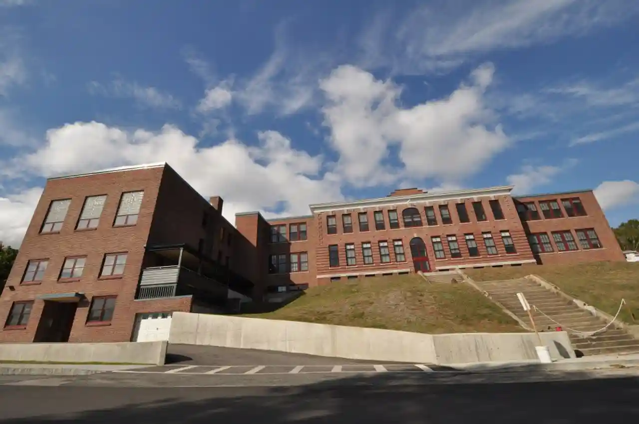 The George E. Burgess School is a historic former school building in Berlin, New Hampshire. Built in 1905 as a public elementary school, it is a well-preserved example of an early 20th-century public school building. It became Notre Dame High School in 1942, operated by the local Roman Catholic diocese, and was the city's first Catholic high school. Closed in 1972, it has since been converted into senior living. The building was listed on the National Register of Historic Places in 2015. Read more on Wikipedia