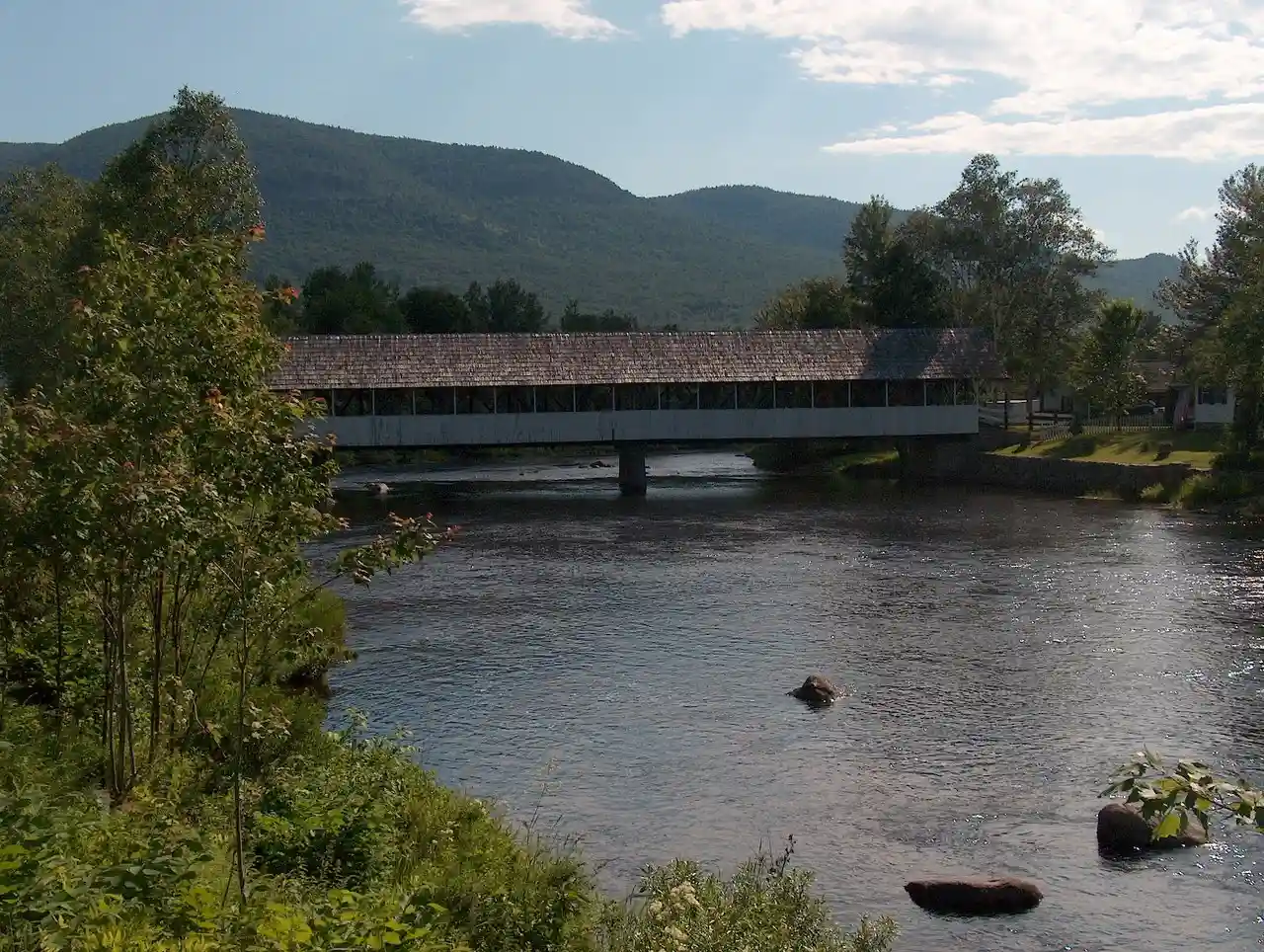 The Stark Covered Bridge is a historic wooden covered bridge over the Upper Ammonoosuc River in Stark, New Hampshire. It carries a connecting roadway which joins the Northside Road to New Hampshire Route 110. The bridge was built in either 1857 or 1862 (sources differing), replacing a floating bridge that had been located a short way upstream. It is a two-span Paddleford truss bridge, which is a regional variant of the Long truss. It is long with a span of , and is wide, carrying an wide roadway and two sidewalks. The shore ends of the bridge rest on abutments of granite stone, while the center of the bridge is supported by a reinforced concrete pier, which is flared on the upstream side to deflect debris. The bridge is reinforced with steel beams, giving it a carrying capacity of 15 tons. It is decorated with pendant acorn finials and painted bright white. Read more on Wikipedia