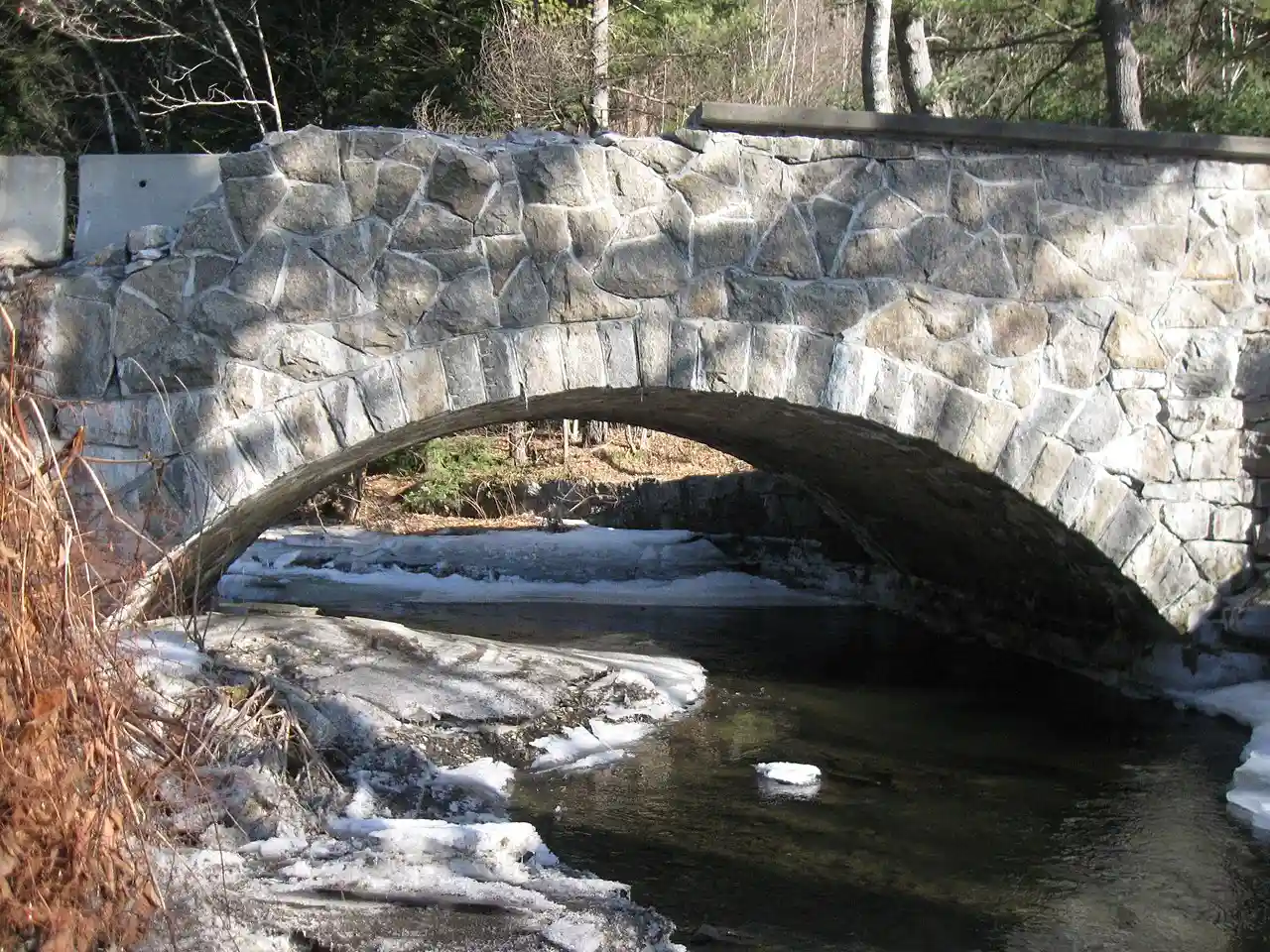 The Great Hollow Road Stone Arch Bridge (also known as the Etna Stone Bridge) is a historic stone arch bridge carrying Great Hollow Road over Mink Brook in Hanover, New Hampshire. Built by the town in 1914, it is one of two stone bridges in the town, and a finely crafted and little-altered example of stone masonry of the period. The bridge was listed on the National Register of Historic Places in 1997. Read more on Wikipedia