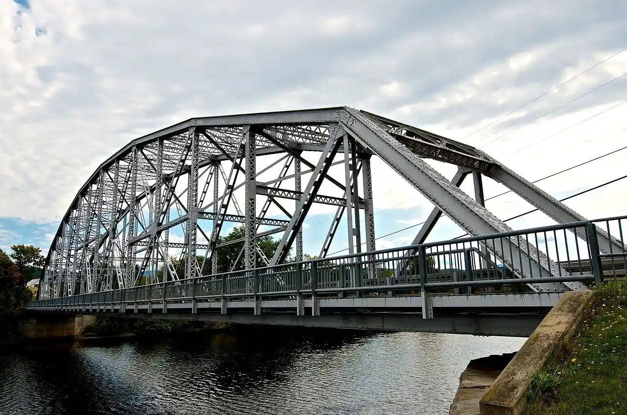 The Piermont Bridge carries New Hampshire Route 25 over the Connecticut River to the contiguous Vermont Route 25 between Piermont, New Hampshire and Bradford, Vermont. It is a Pennsylvania steel through truss bridge, built by the Boston Bridge Works in 1928. The bridge consists of a single span with a clear span of 352' and an overall length of 354'10". The roadbed is 20'7" wide, with a vertical clearance of 14'7". The bridge is approximately 25' above the river. The western (Vermont) abutment is made of split granite quarried from nearby Fairlee Mountain, while the eastern abutment is an early concrete construction built in 1908 by John Storrs for an earlier bridge. The bridge underwent a major renovation in 1993 which included the addition of a sidewalk (under which utilities were laid) and replacement of much of the bridge decking. Read more on Wikipedia