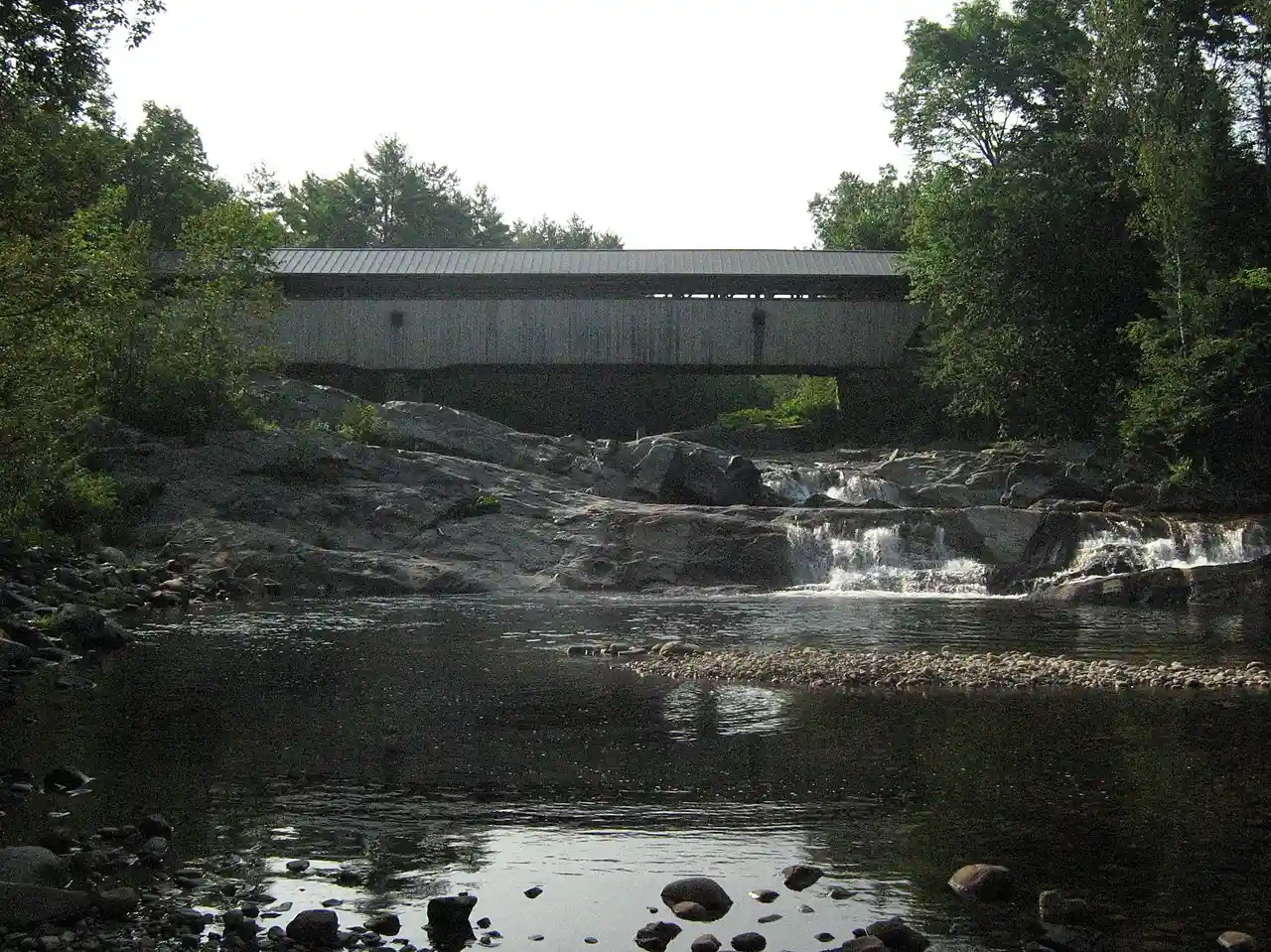 The Swiftwater Covered Bridge is a historic covered bridge which carries Porter Road over the Wild Ammonoosuc River in Bath, New Hampshire. Built in 1849, it is one of New Hampshire's few surviving 19th-century covered bridges, and a well-preserved example of the Paddleford truss design. The bridge was added to the National Register of Historic Places in 1976. Read more on Wikipedia